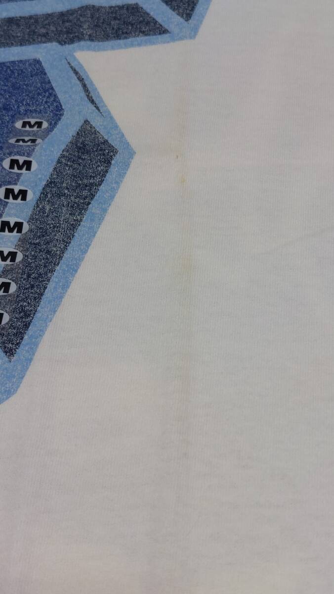長期保管時についた特に分かる経年劣化として先ずは肩回りが茶色くシミが出来てしまっております(画像8参照) 続いてフロントの畳んで保管していた際についた畳み目にそった茶色いシミです。特にフロントプリント左側についた縦線状の茶色いシミはハッキリとしていて目立ちます(画像9参照)