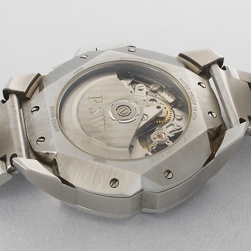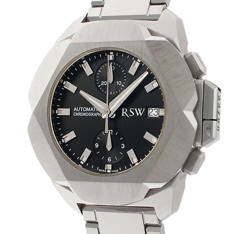 備考:マットなブラックフェイスと44ミリの大きめケースにシルバーカラーの針とバーインデックスが配された「ナスカ クロノグラフ」。ガラスコーティング膜に剥がれが見られますが、ユニークな形状のステンレスケースが備わった個性的なアイテムです。