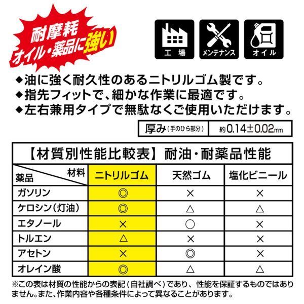 耐摩耗かつオイルや薬品に強い 油に強く耐久性のあるニトリルゴム製です 指先フィットで細かな作業に最適です 左右兼用タイプで無駄なくご使用いただけます 粉なし シワ加工 【商品詳細】 ★Lサイズ 全長:約240mm(全サイズ共通) 厚み(手のひら部分):約0.14±0.02mm(全サイズ共通) 中指の長さ:約88mm 手の平まわり:約210mm 個装サイズ:120mmX220mmX45mm 個装重量:約370g 内容量:50枚入 用途:機械整備業、工場作業、建設業、塗装作業、各種メンテナンス作業 カラー:ブラック 材料:ニトリルゴム 製造国:マレーシア 発売元:ミタニコーポレーション株式会社 JANコード:4956668101671 |