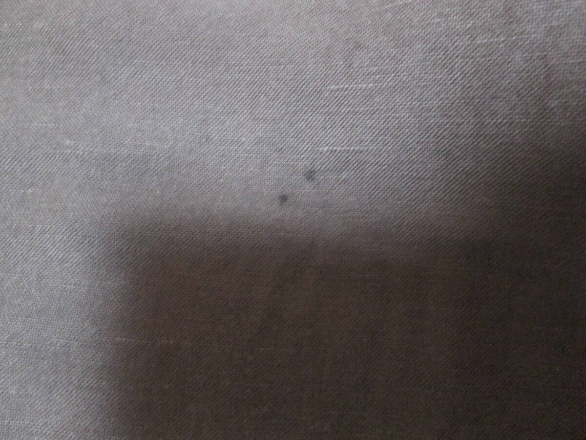 着用回数3.4回程度、着用感少なく目立たないように思いますが右前にペン先程度のぽつんとしみがあります。リネン混なのでリネン特有の色感・たたみじわ等細かな点にご了承いただける方に。