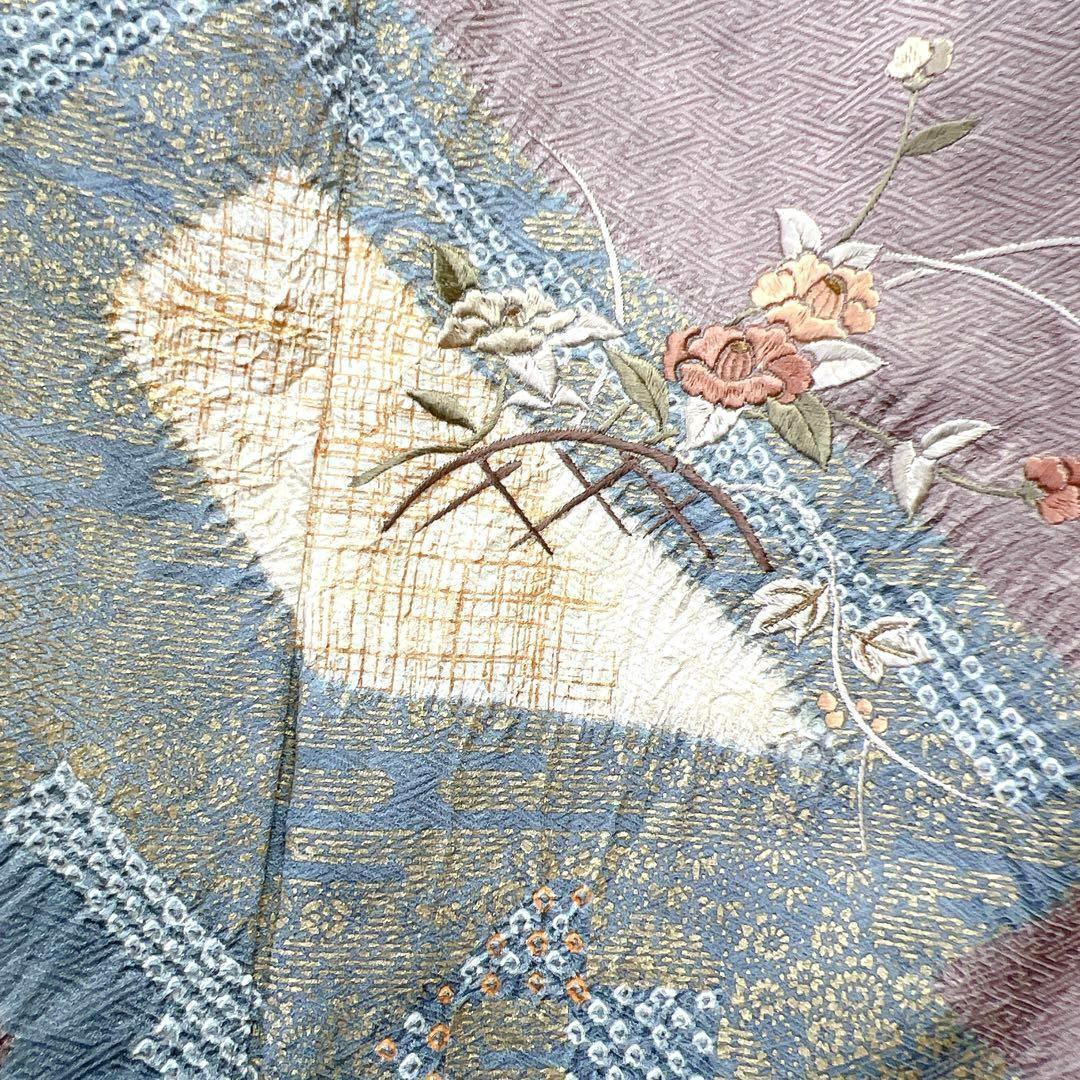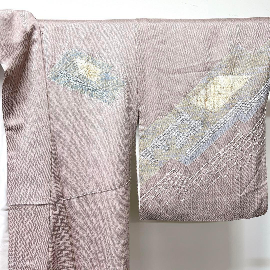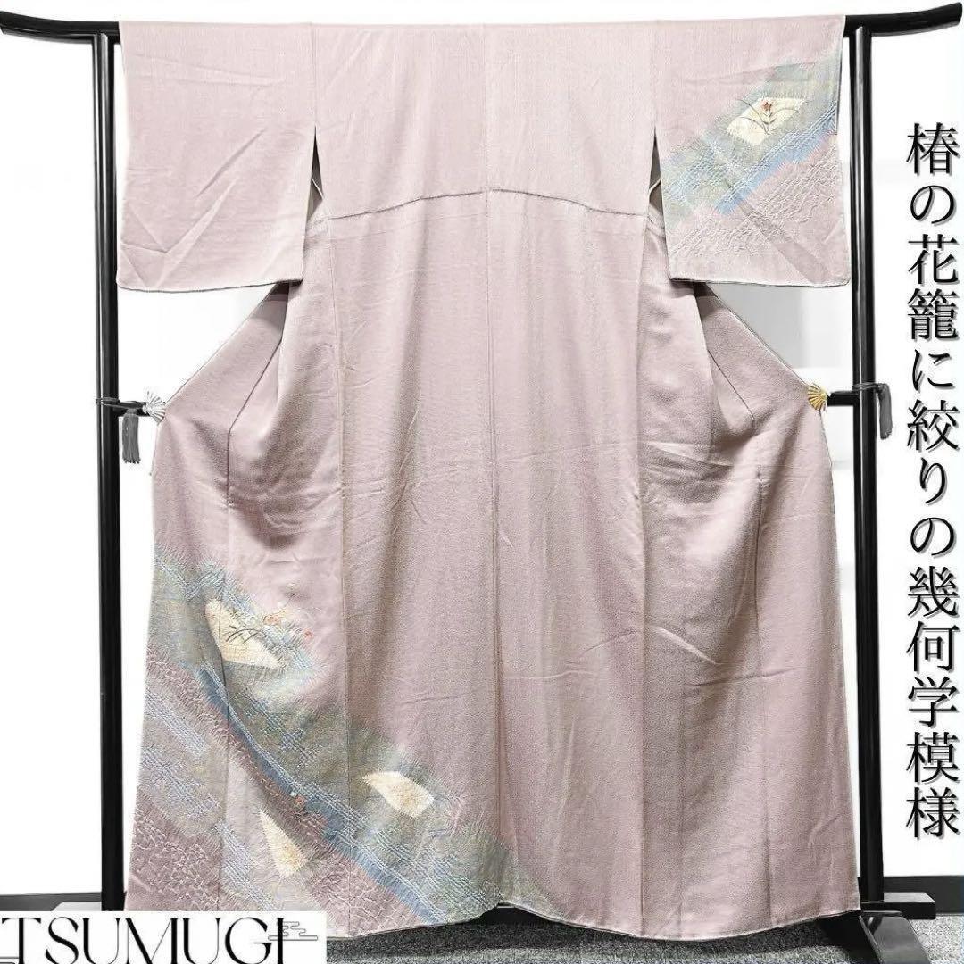くすみ薄紫色に椿の花籠に絞りで描かれた幾何学模様がお洒落な一着です。