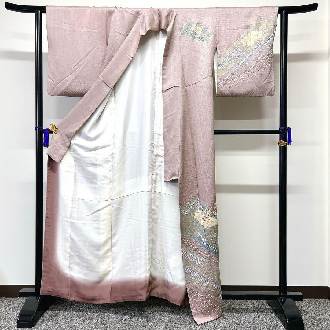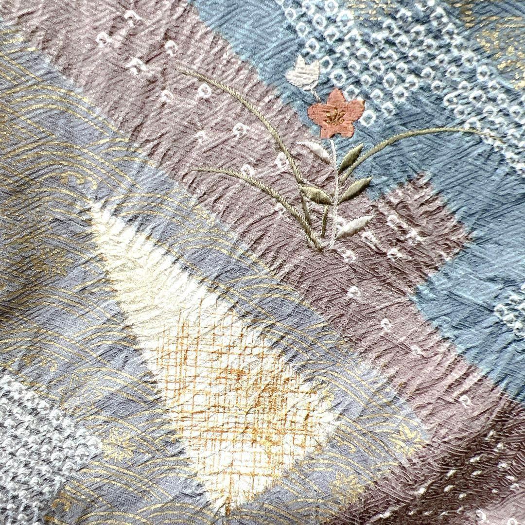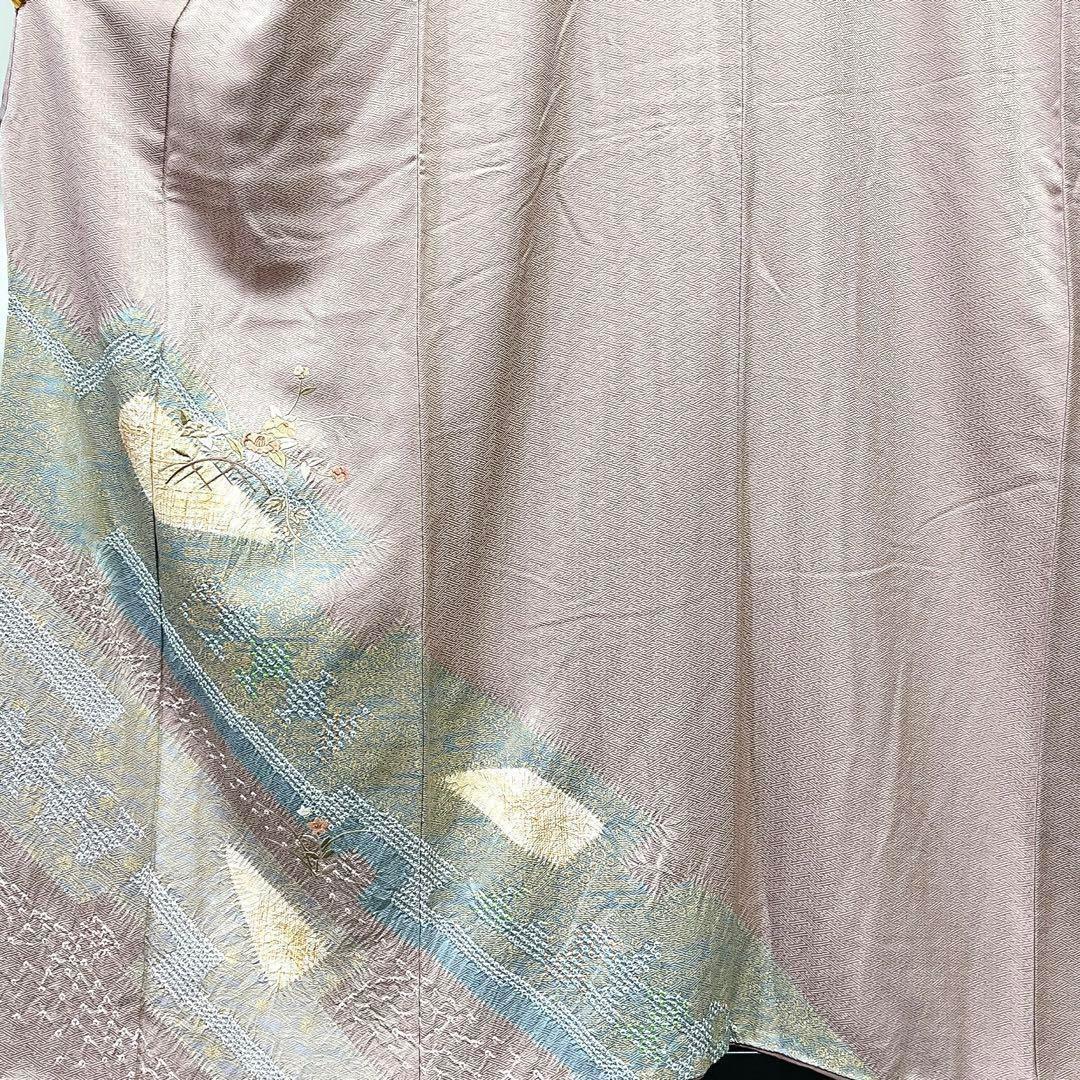 くすみ薄紫色に椿の花籠に絞りで描かれた幾何学模様がお洒落な一着です。