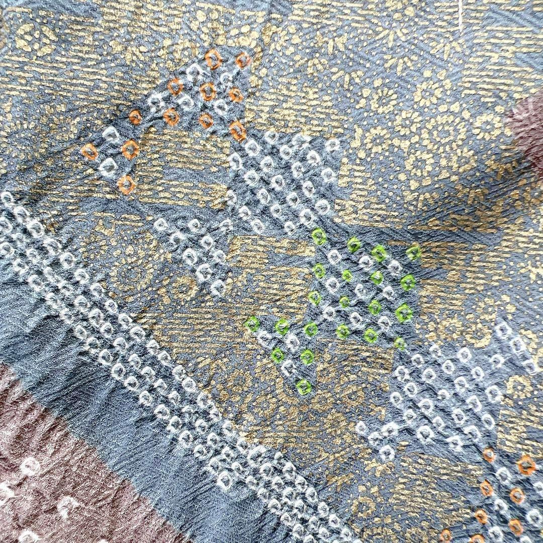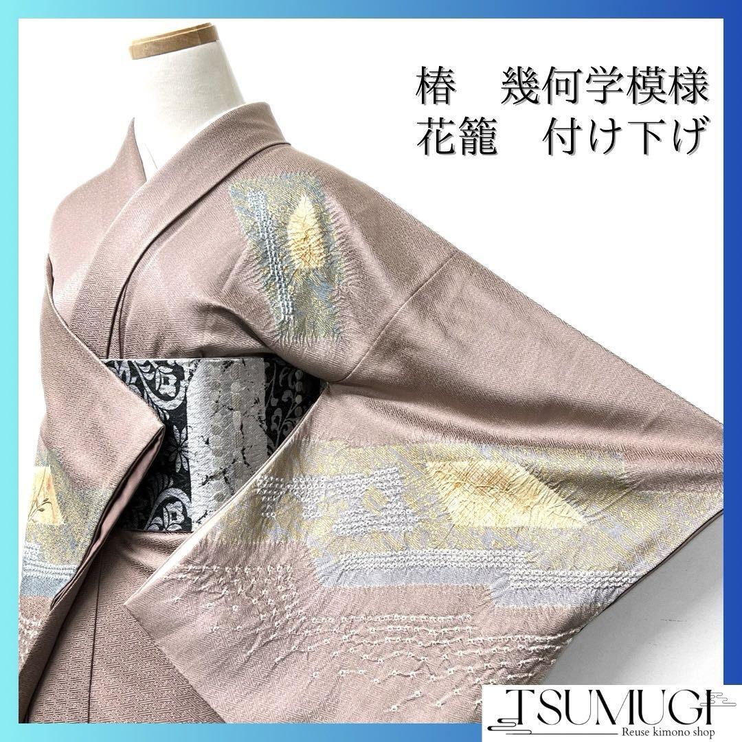 椿の花籠に絞りの幾何学模様の付け下げ 着物 122w