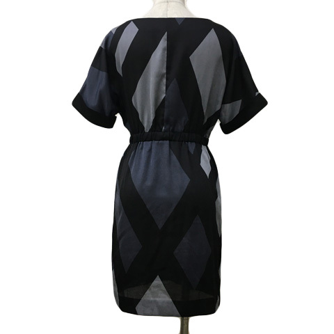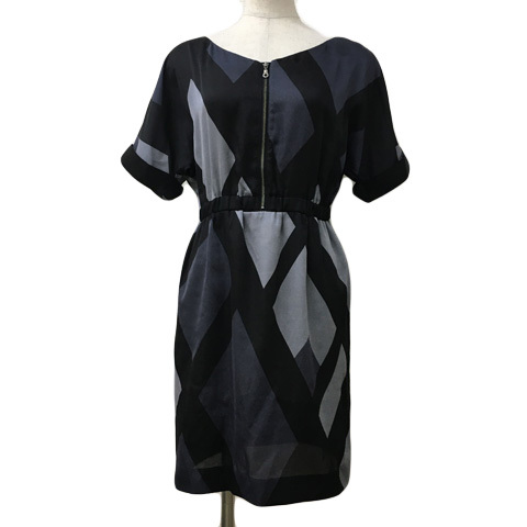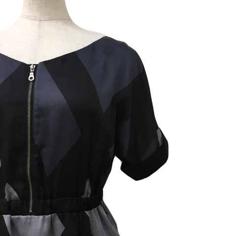 インディヴィ GALLEST ワンピース Iライン ミニ 総柄 ジップアップ ウエストゴム ドルマンスリーブ 半袖 05 黒 グレー ブラック レディース