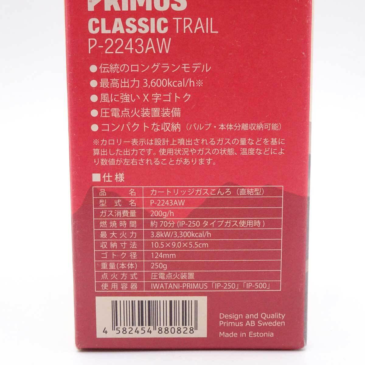 ※商品は画像にあるものがすべてとなります。 【仕様】 ブランド:プリムス タイプ:クラシックトレイル ストーブ バーナー 型番:P-2243AW 重量:250g 収納時サイズ:10.5×9.0×5.5cm ガス消費量:200g/h 出力:最大3.8kW/3300kcal/h PSマークの種類:PSLPG 届出事業者名:イワタニ・プリムス株式会社 登録検査機関:JIA 詳細備考:ゴトク径124mm |