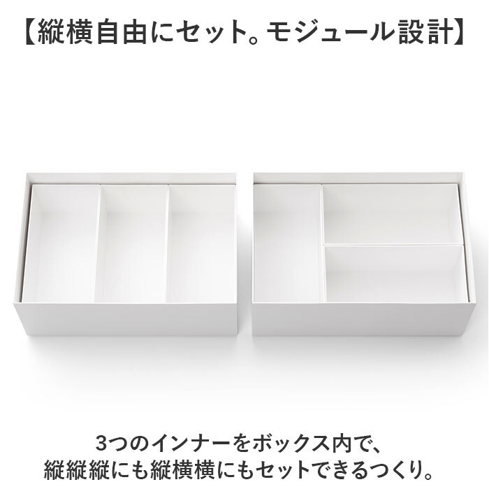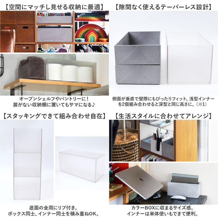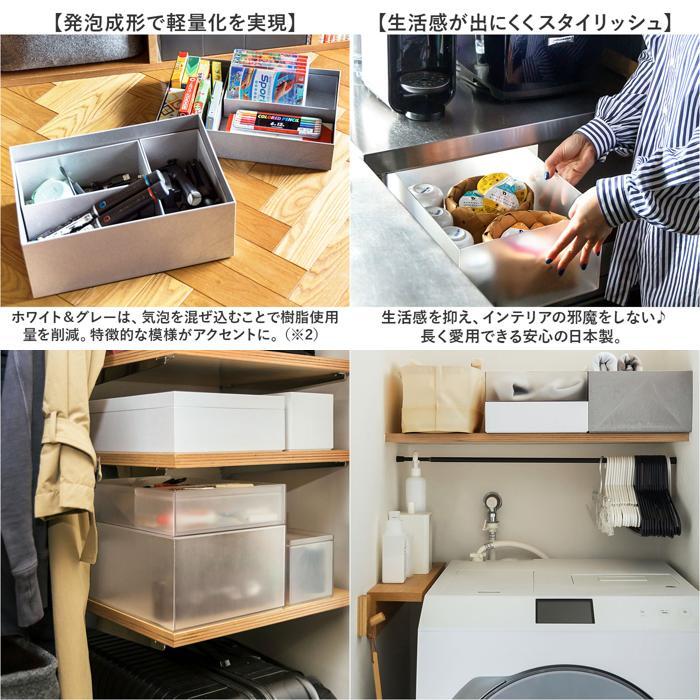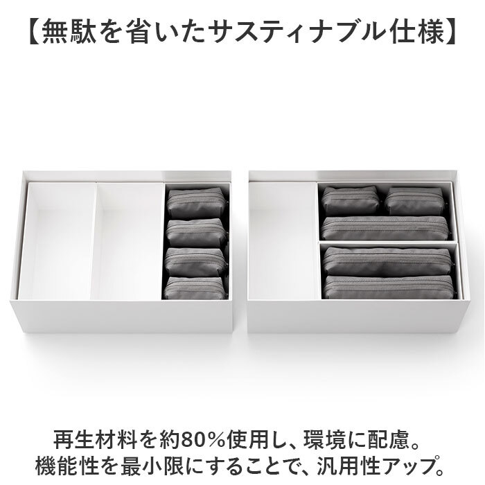 | 商品説明 | ・・【究極にシンプルな収納セット】 ・使い方を選べてすっきり整頓◎「タイディアップ スターターキット深型4点」が新登場。 ・【縦横自由にセット。モジュール設計】 ・・3つのインナーをボックス内で、縦縦縦にも縦横横にもセットできるつくり。 ・【無駄を省いたサスティナブル仕様】 ・再生材料を約80%使用し、環境に配慮。機能性を最小限にすることで、汎用性アップ。 ・【空間にマッチし見せる収納に最適】 ・オープンシェルフやパントリーに!扉がない収納棚に置いてもサマになる♪ ・【隙間なく使えるテーパーレス設計】 ・側面が垂直で壁際にもぴったりフィット。浅型インナーを2個組み合わせると深型と同じ高さに。 ・(※1)浅型タイプは当店別ページで販売中です。 ・【スタッキングできて組み合わせ自在】 ・底面の全周にリブ付き。ボックス同士、インナー同士を積み重ねOK。 ・【生活スタイルに合わせてアレンジ】 ・カラーBOXに収まるサイズ感。インナーは単体使いもできて便利。 ・【発泡成形で軽量化を実現】 ・ホワイト&グレーは、気泡を混ぜ込むことで樹脂使用量を削減。特徴的な模様がアクセントに。 ・(※2)環境に配慮した素材で、カラーにより素材が違います。再生材の使用や特殊な成形方法を用いており、表面に一点一点異なる色ムラや空隙等が見られる場合があります。予めご了承ください。 ・【生活感が出にくくスタイリッシュ】 ・生活感を抑え、インテリアの邪魔をしない♪長く愛用できる安心の日本製。 |