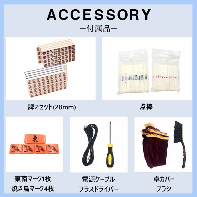 28mm麻雀牌2面(1卓分)、点棒・焼鳥/起家マーク、布カバー、点棒、ドライバー、天板清掃用ブラシ、電源ケーブル、日本語説明書