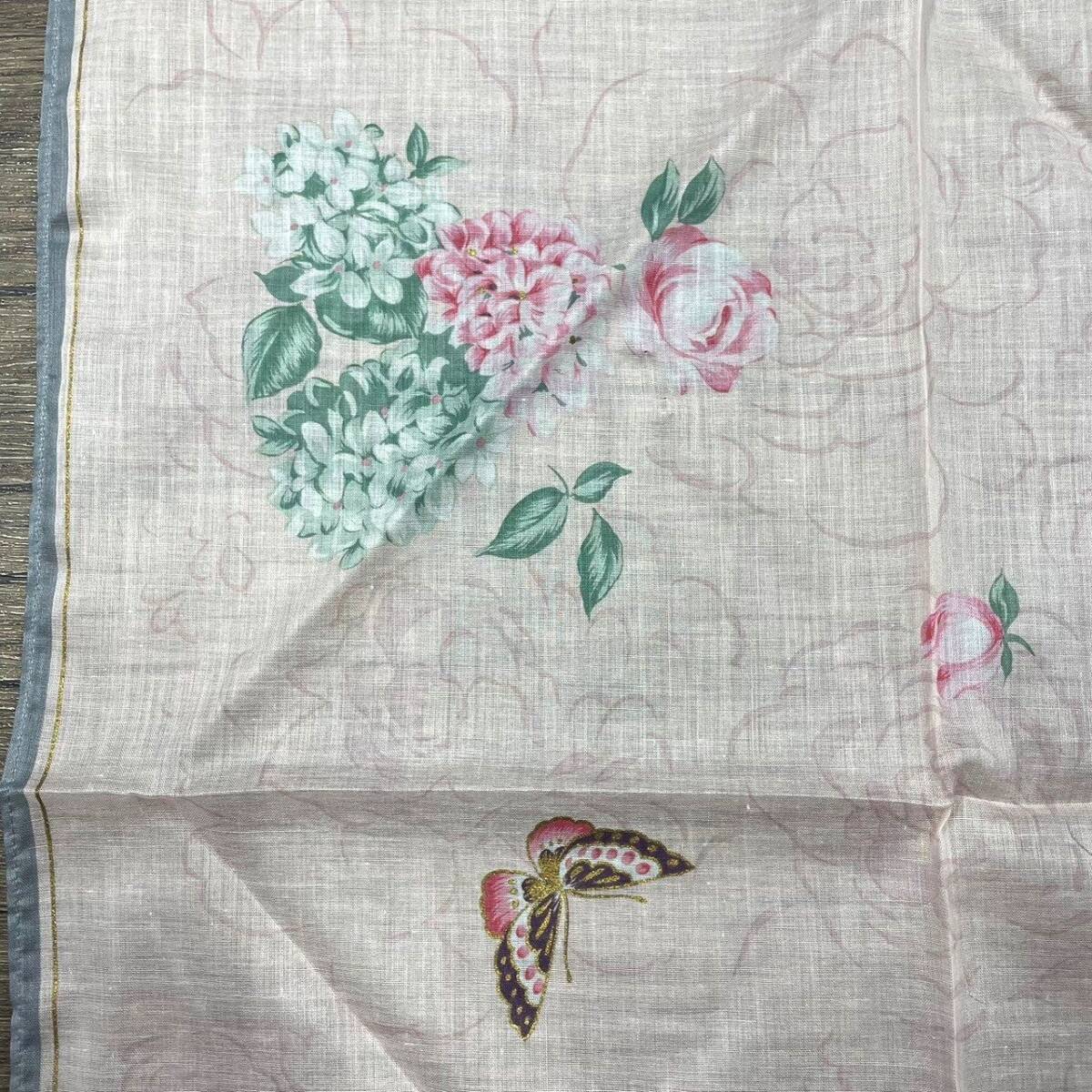 ハンカチ バンダナ 花柄 フラワー バラ 蝶々 バタフライ ライトピンク×ゴールド×縁グレー