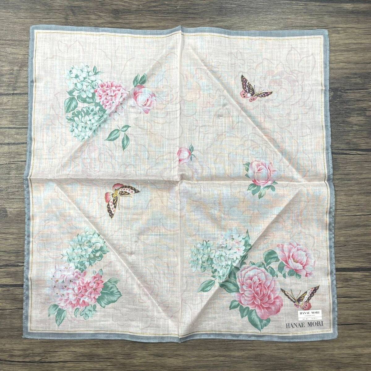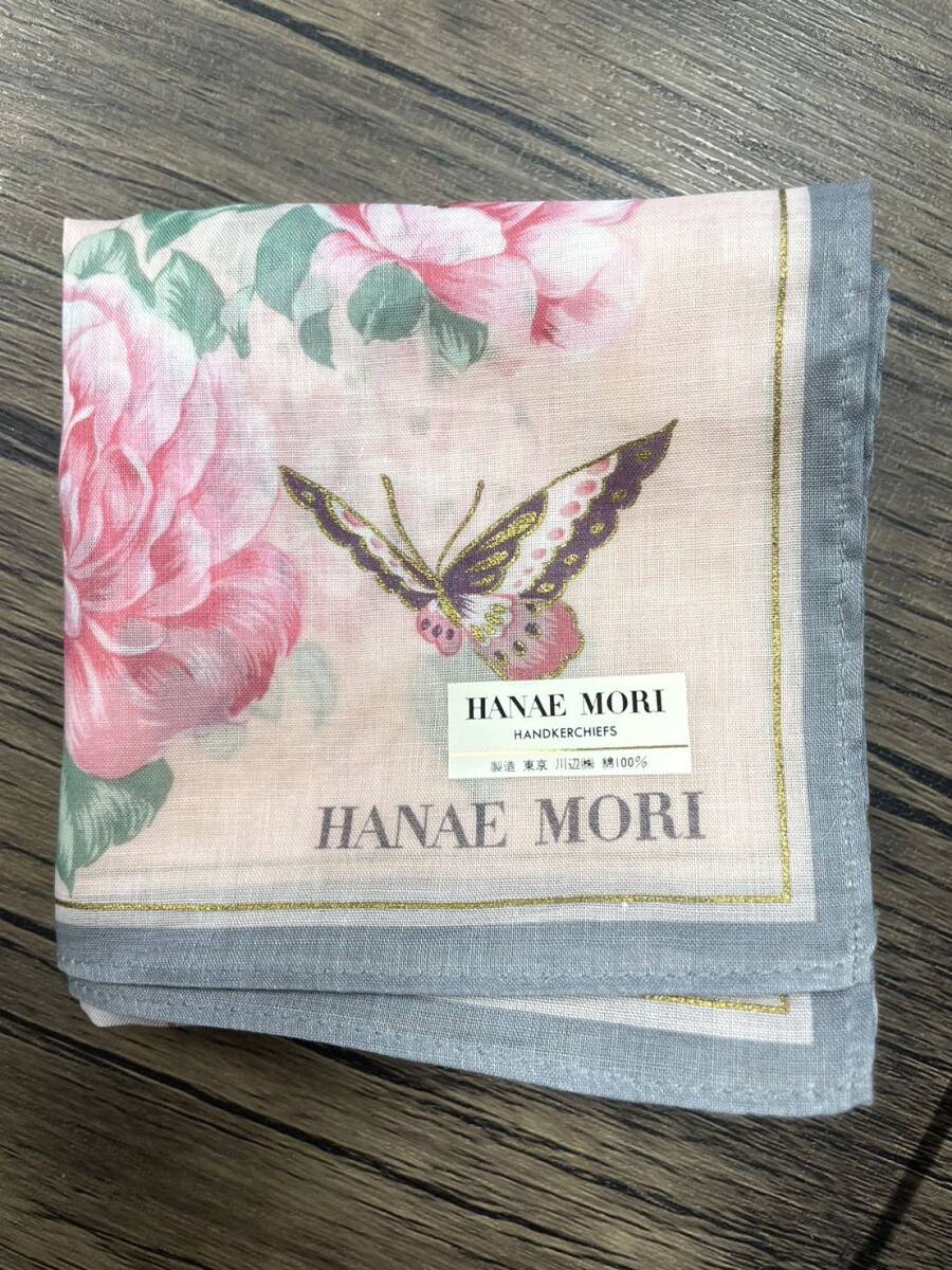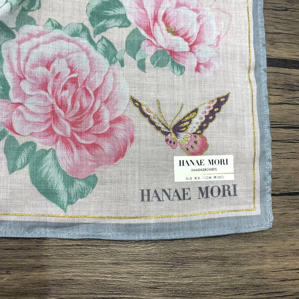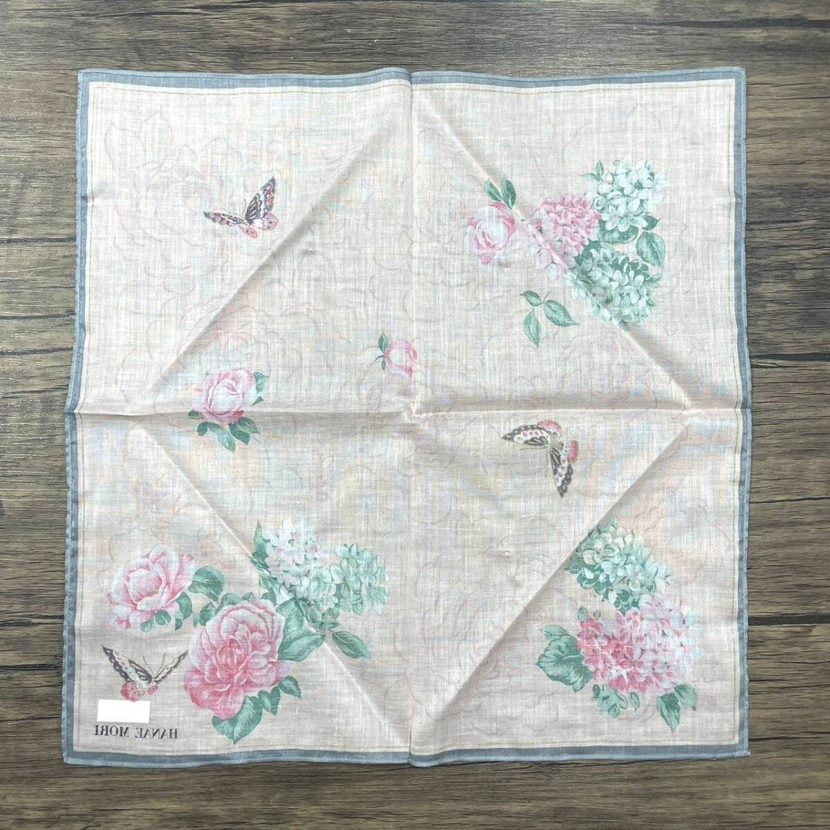 【未使用品】HANAE MORI ハナエモリ ハンカチ バンダナ 花柄 フラワー バラ 蝶々 バタフライ ライトピンク×ゴールド×縁グレー