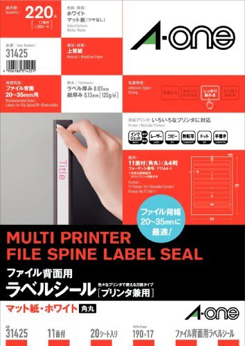 | いろいろなプリンタで印刷できるラベルです。ファイル背幅2?3.5cmに最適なファイル背ラベルです。【特長】・高品質の素材を使用しているため、印刷適性に優れています。・厚み:125g/平方メートル(0.13mm)・入数:20シート・面付き:11面(19×1.7cm) |