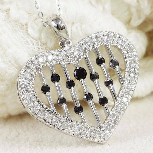 【製造大卸☆最安値】オシャレ ハート ブラック & ホワイト 天然 ダイヤモンド K18 WG ペンダント ネックレス 18金【鑑別書付】