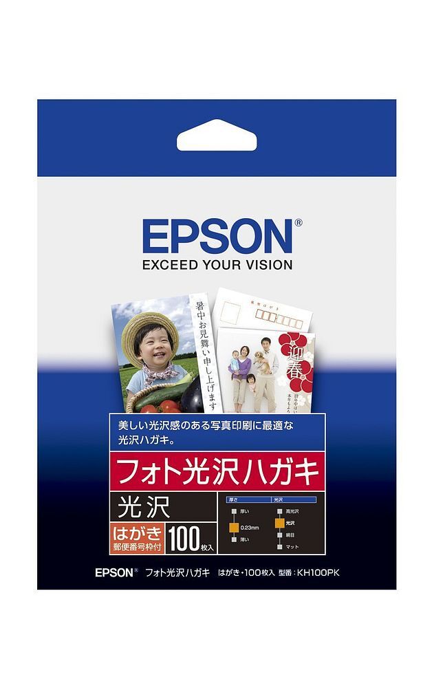 鮮やかな発色の染料専用ハガキ。写真にこだわった年賀状の印刷にもおすすめです。厚さ:0.23mm