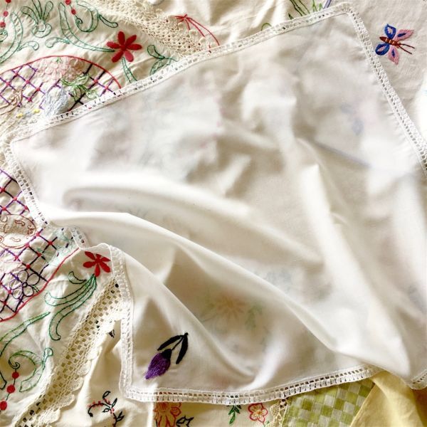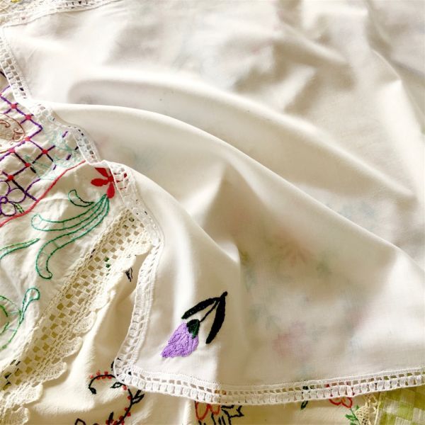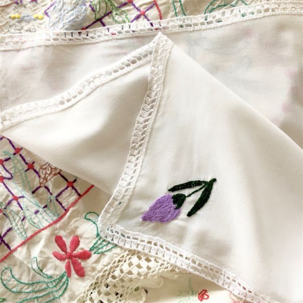 50x48cm フランスヴィンテージ 手刺繍手縫手編 浮かぶヴィオレ花とおとぎ話的テーブルセンター アンティーク レース ハンドメイド