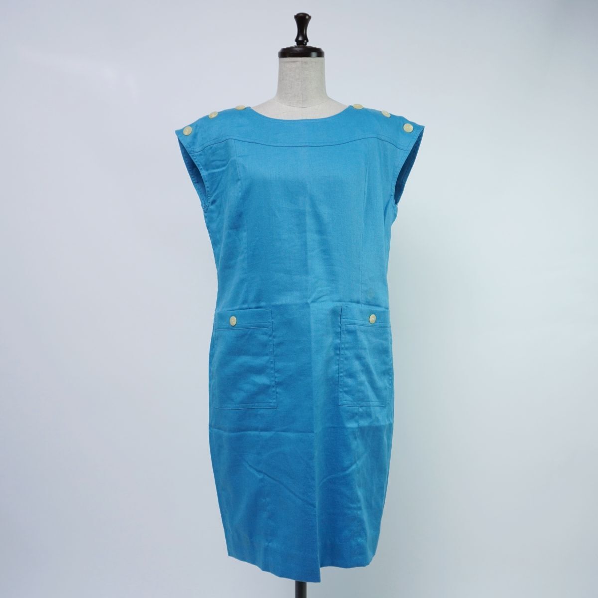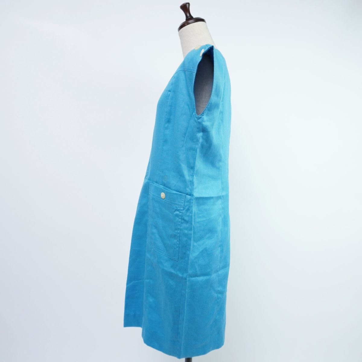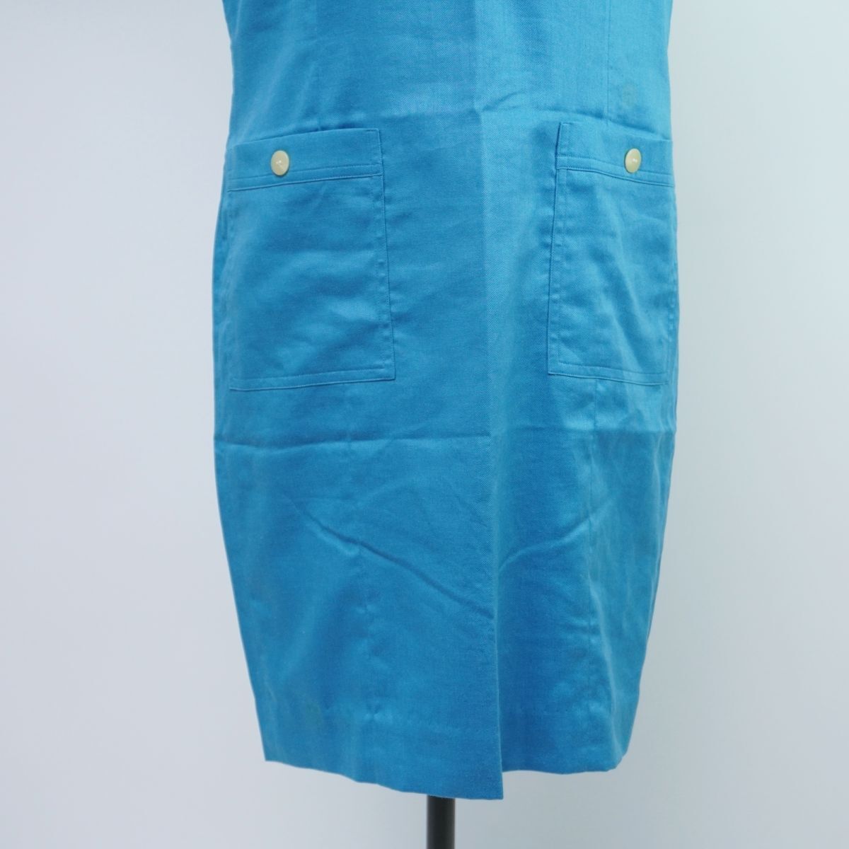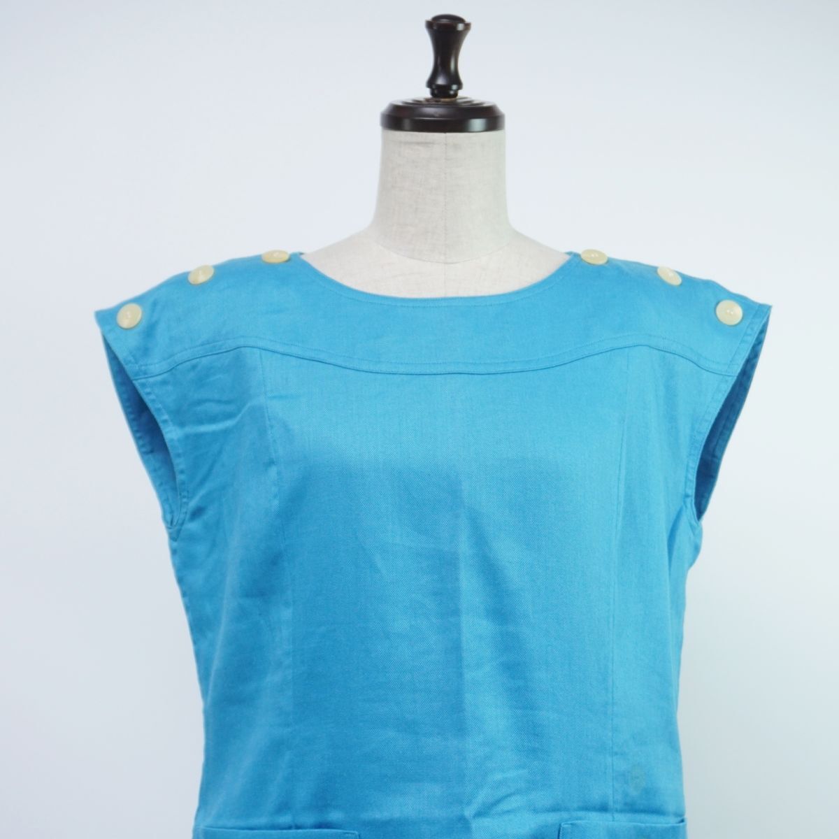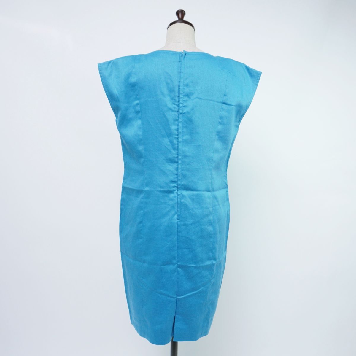 美品 Leilian レリアン リネン混 ショルダーボタンデザイン フレンチスリーブワンピース 膝丈 レディース ターコイズブルー サイズ9*RC821
