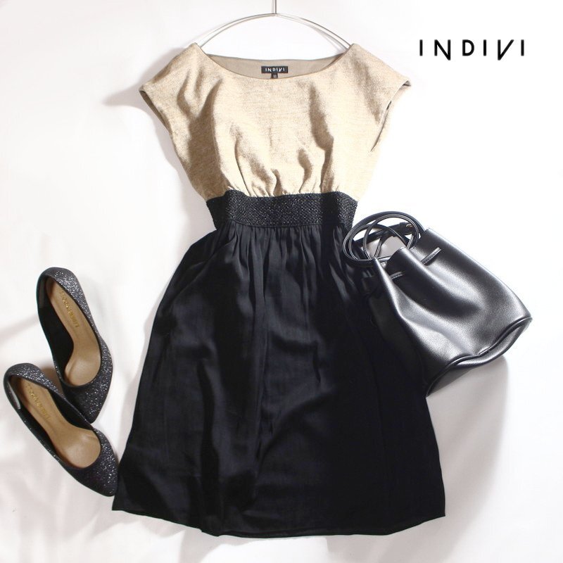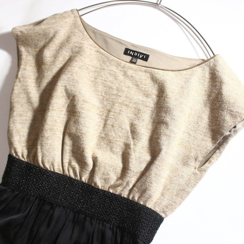 インディヴィ INDIVI 株) ワールド 小さいサイズ03 3号 レザーパイピング ニット × とろみシフォン 切替 ワンピース ベージュ ブラック 黒