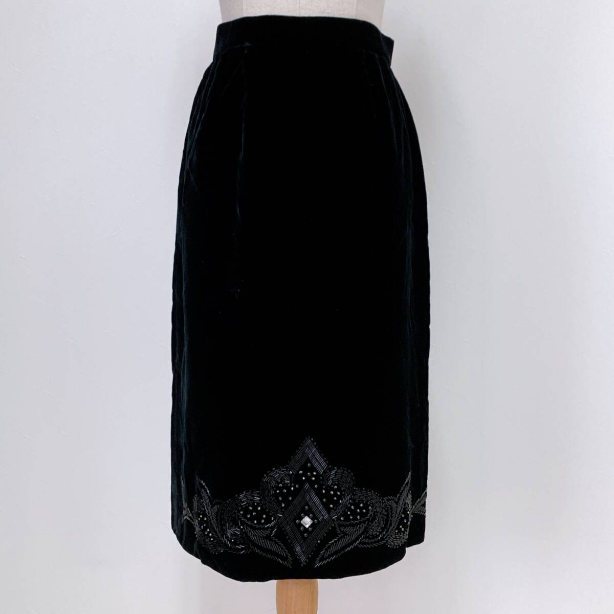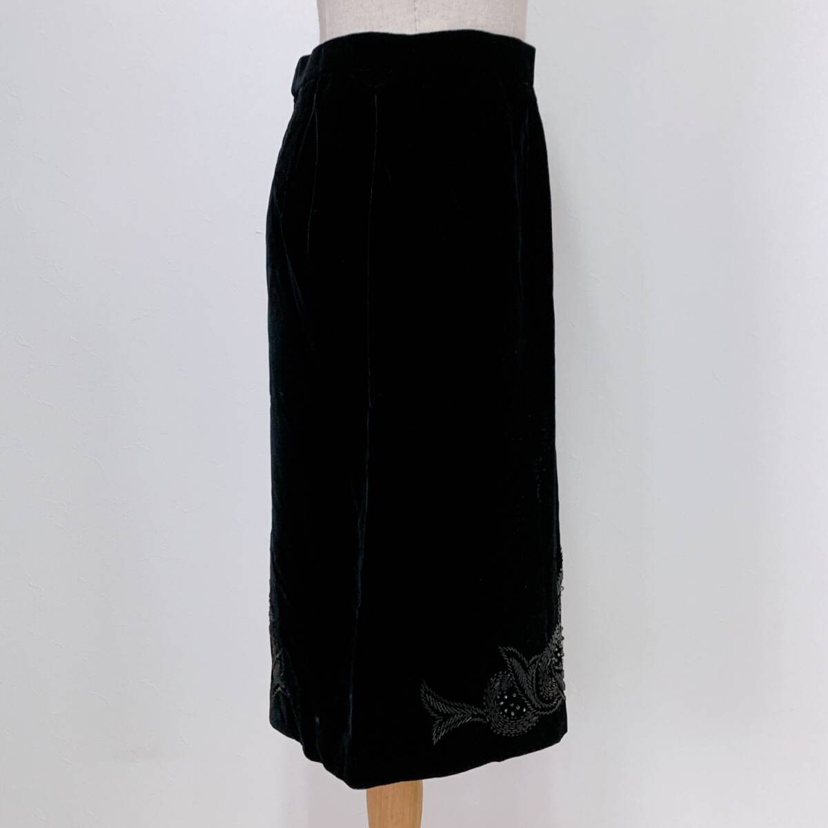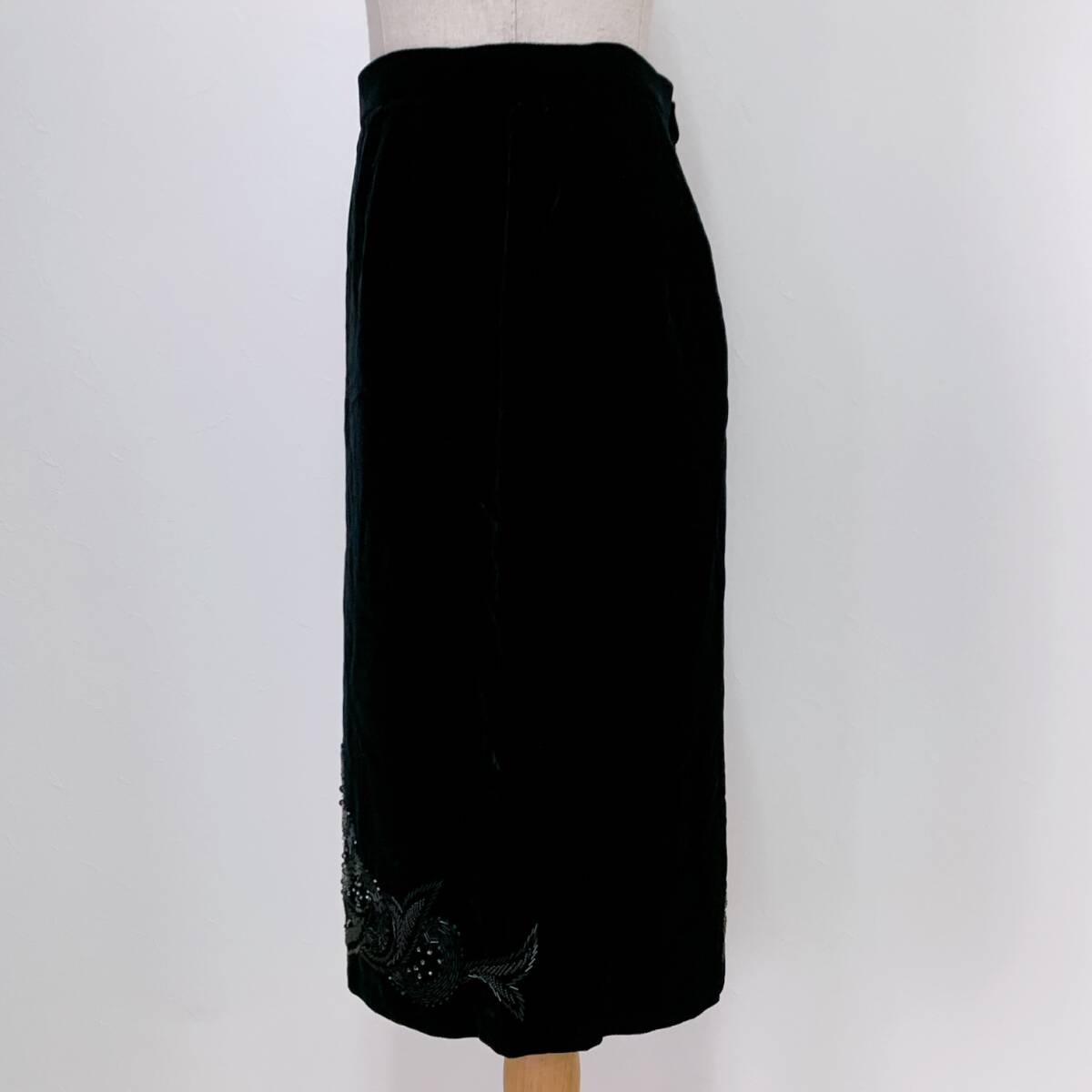 YH0858 glacon-R レディース ベロア調 ひざ下丈 スカート スリット ブラック 黒 11号 ビジュー 裏地あり 上品 お洒落 万能 USED 古着