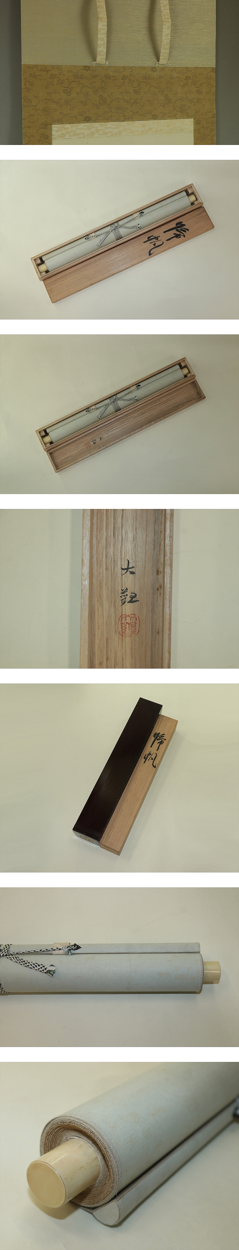 横山大観 よこやま-たいかん(1868-1958) 日本画家。茨城県生。名は秀麿。岡倉天心・橋本雅邦に学ぶ。 天心の日本美術院創立に参加、また日本美術院を再興し中心作家として活躍。 明治・大正・昭和の三代に亘り第一線で日本画を革新し続けた。 文展審査員・帝室技芸員・帝国美術院会員。朝日文化賞受賞。文化功労者。文化勲章受章。 昭和33年(1958)歿、89才。 本紙は、染み、軽い折れがあります。 表装は、染み、汚れ、皺があります。 【サイズ】 作品 横約36cm×縦約113cm 表装 横約49cm×縦約201cm |
