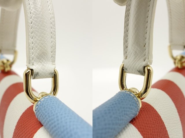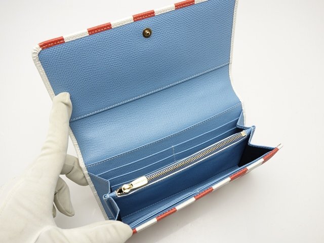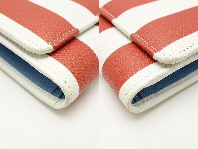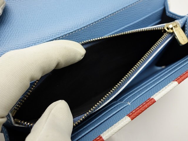 ● コメント  鮮やかなカラーのチェーンウォレット。内側にファスナー小銭入×1、カード入×12、札入れ×2、フリーポケット×2。状態は全体に綺麗ですが、角スレ、プレートに小傷、小銭入れに汚れが少しみられます。またハンドル付け根部分に汚れが見られます。