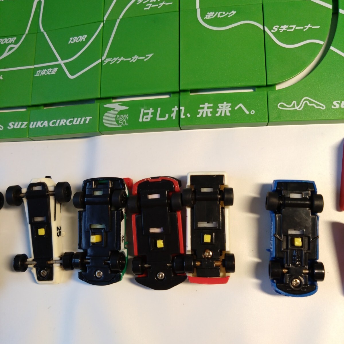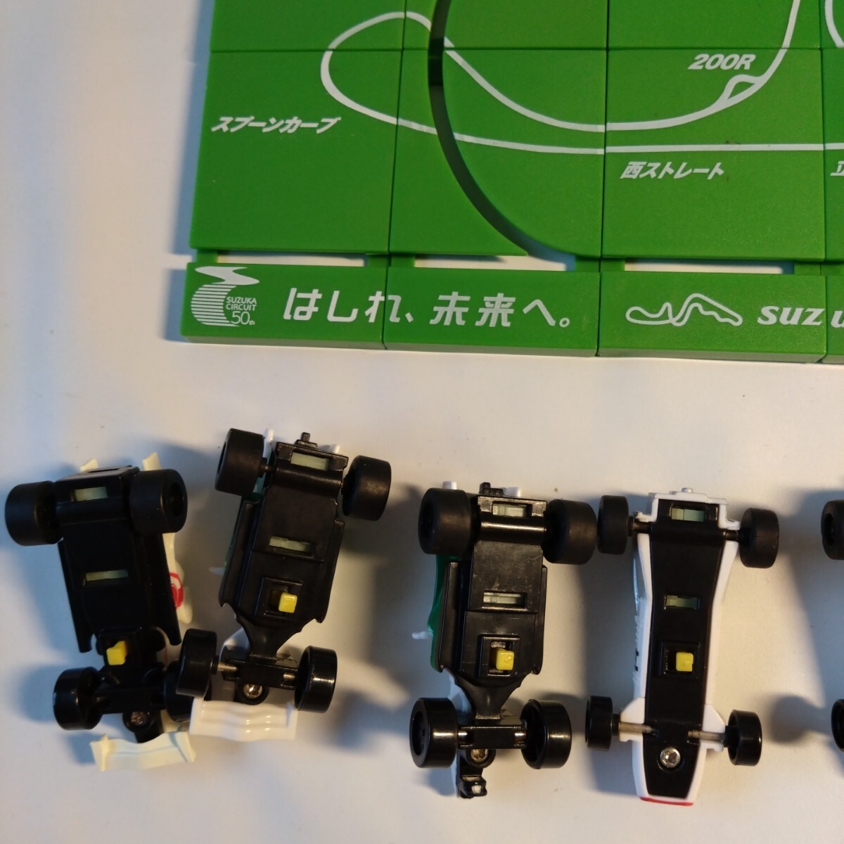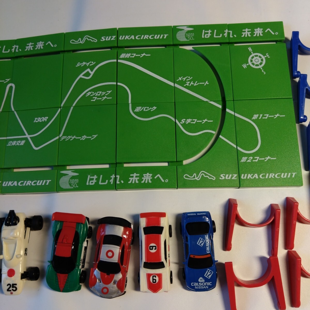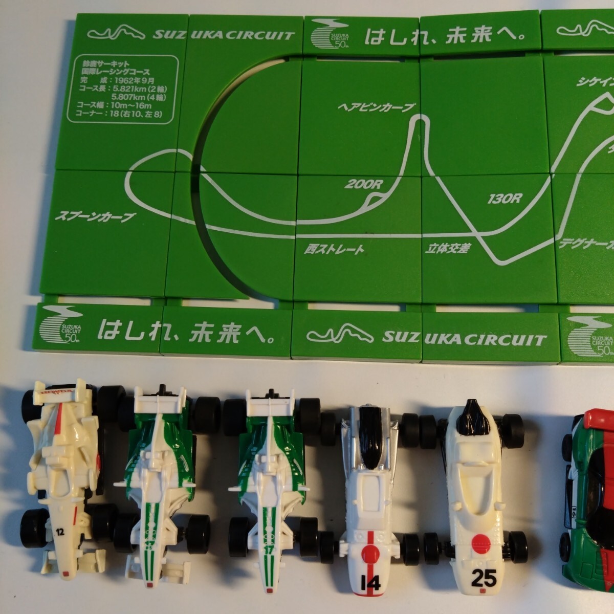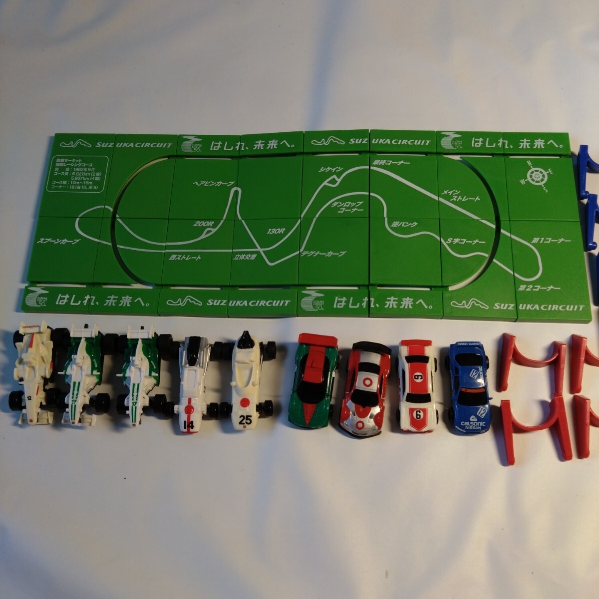 缶コーヒーのおまけで集めたミニカー9台と鈴鹿サーキットコースのセットです。破損や傷はありません。