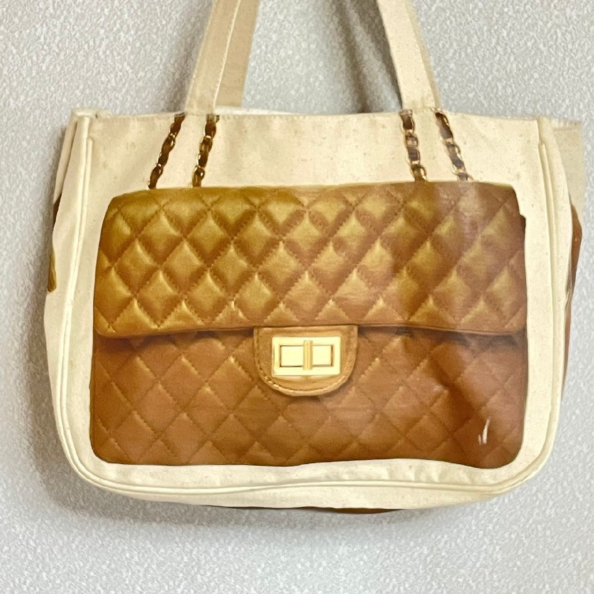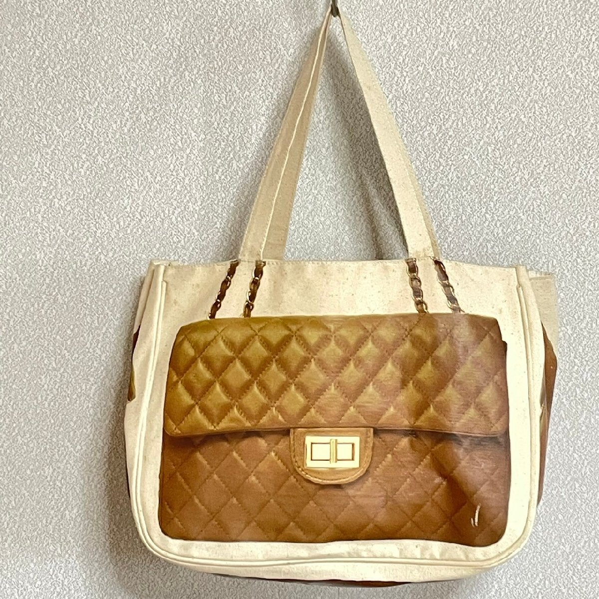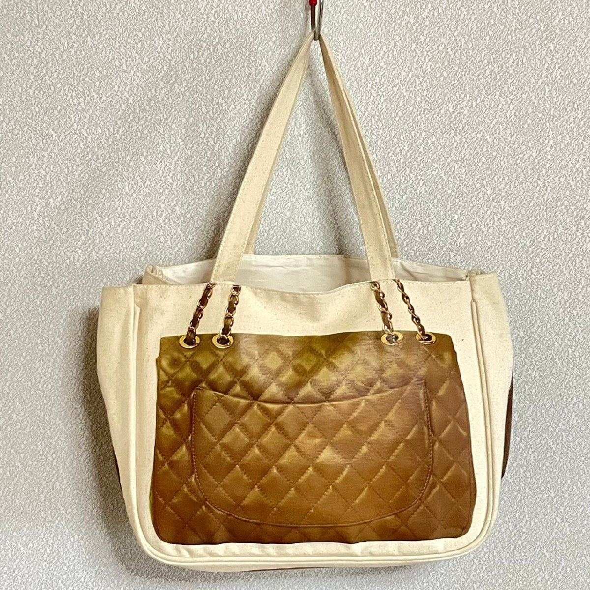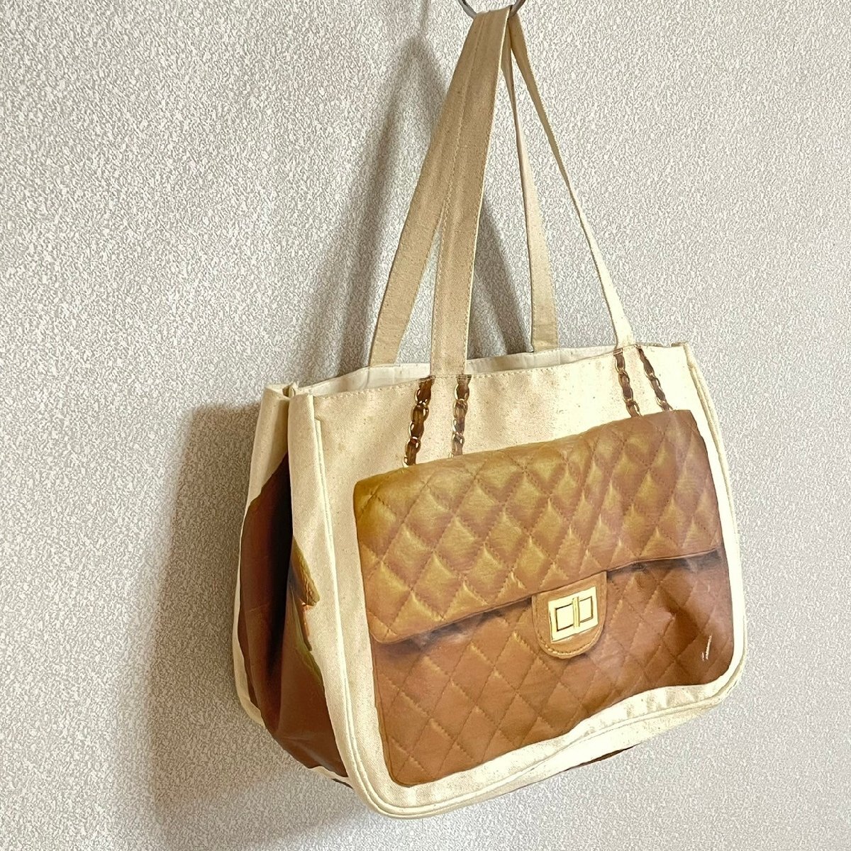 《Thursday Friday サーズデイ フライデイバックに高級バッグをプリントしたユニークデザイン♪底やサイドなど、細部までこだわりのディティールプリントが特徴!使えば使うほど味が出てヴィンテージ風に変化する!通勤・通学、旅行ママバッグとしてもOKな大きめサイズ!裏地・ポケット付きで機能性ももちろん◎♪iPadやA4サイズの書類が入るサイズ感。より持ち歩きやすいように丸みを帯びたシルエットでデザインしたトートバッグです。カジュアルなコーデにはもちろん、ストリート、古着MIXやキレイめなスタイリングとも相性が良く、シーズンレスでお使いいただけます。この機会に是非ご検討ください。