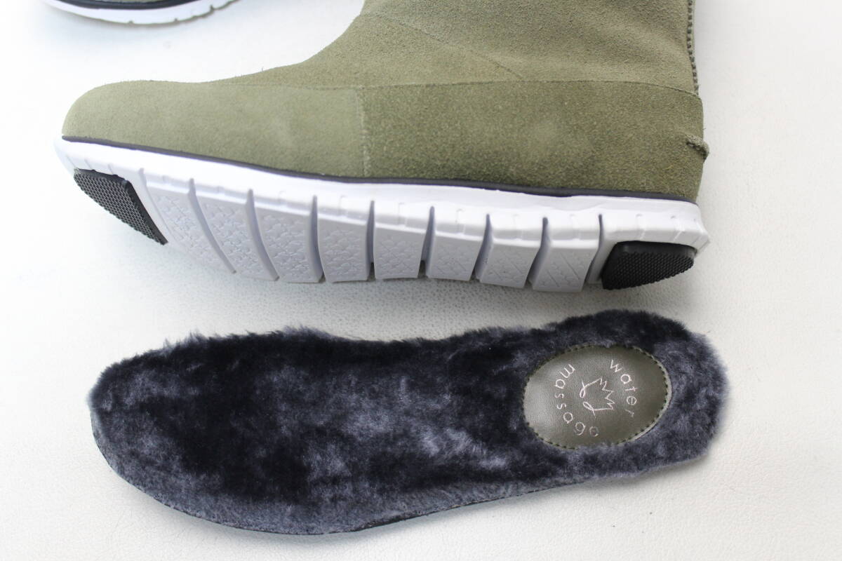 ◇ライニングとおなじ素材で作ったエコファーの中敷は、底冷えを防ぎ、ふんわり暖かな履き心地。