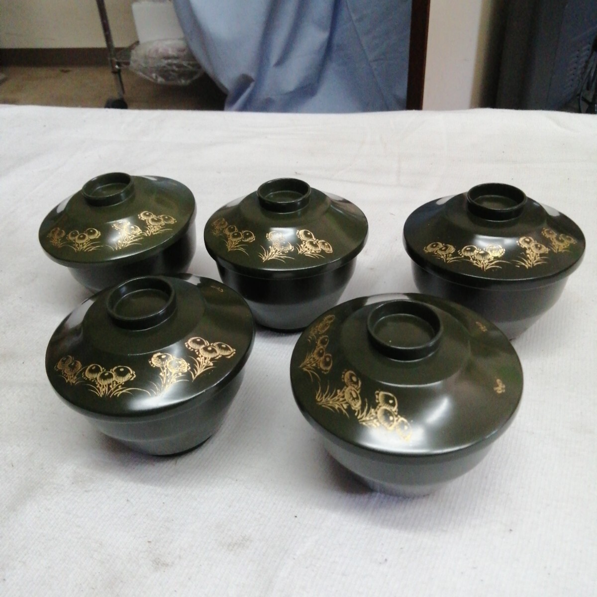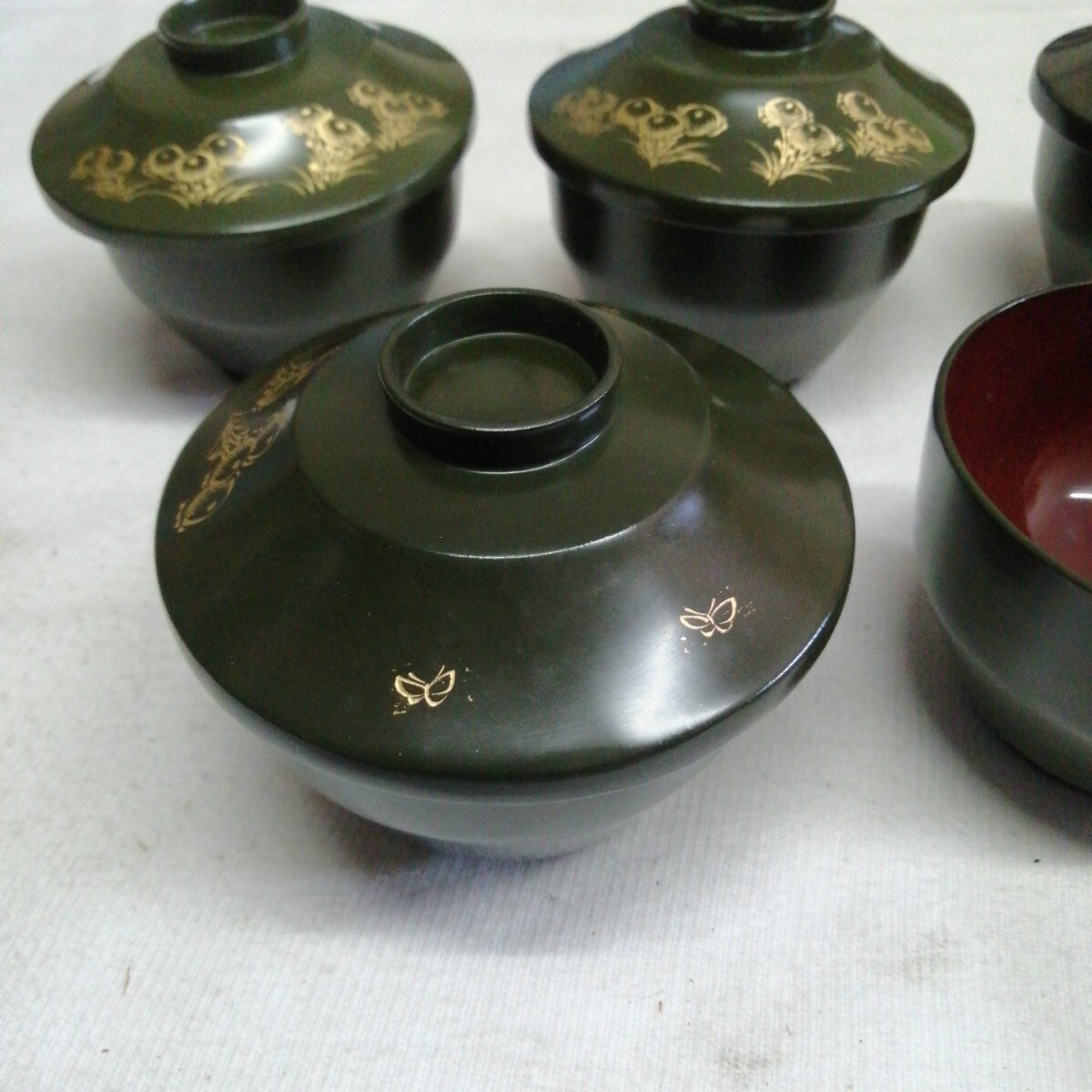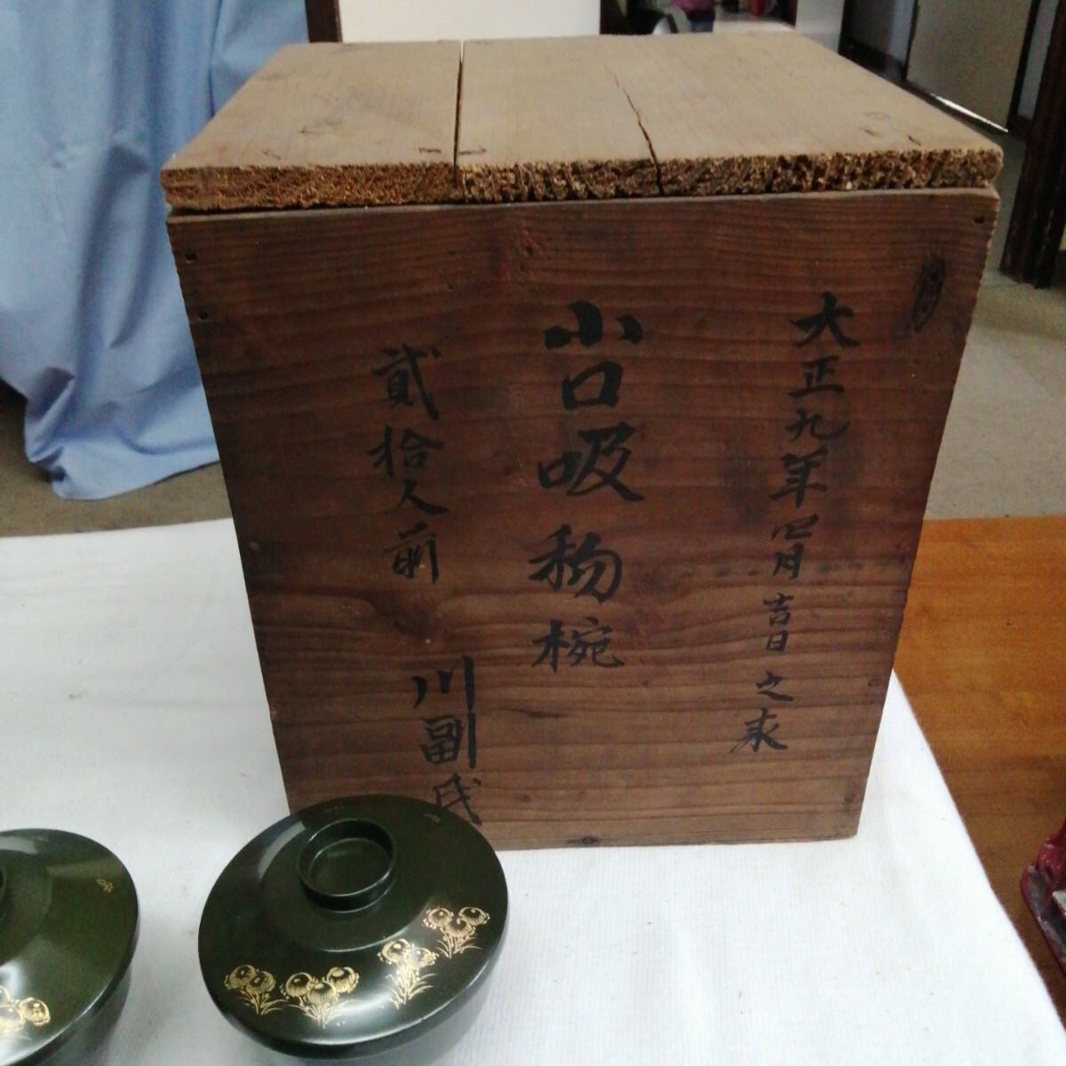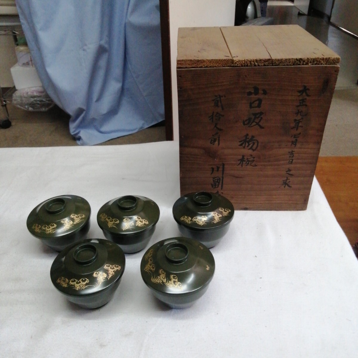 計20客揃 大正9年 小口吸物椀 木 塗 蝶々 花 華 緑 蓋付き 木箱入 古物 骨董 器 汁椀
