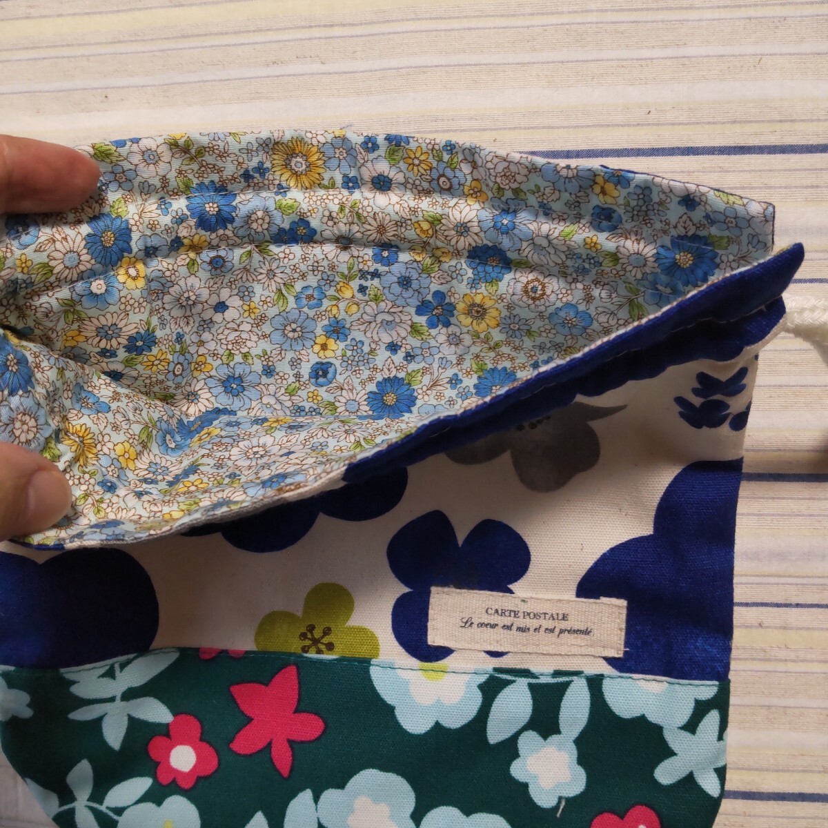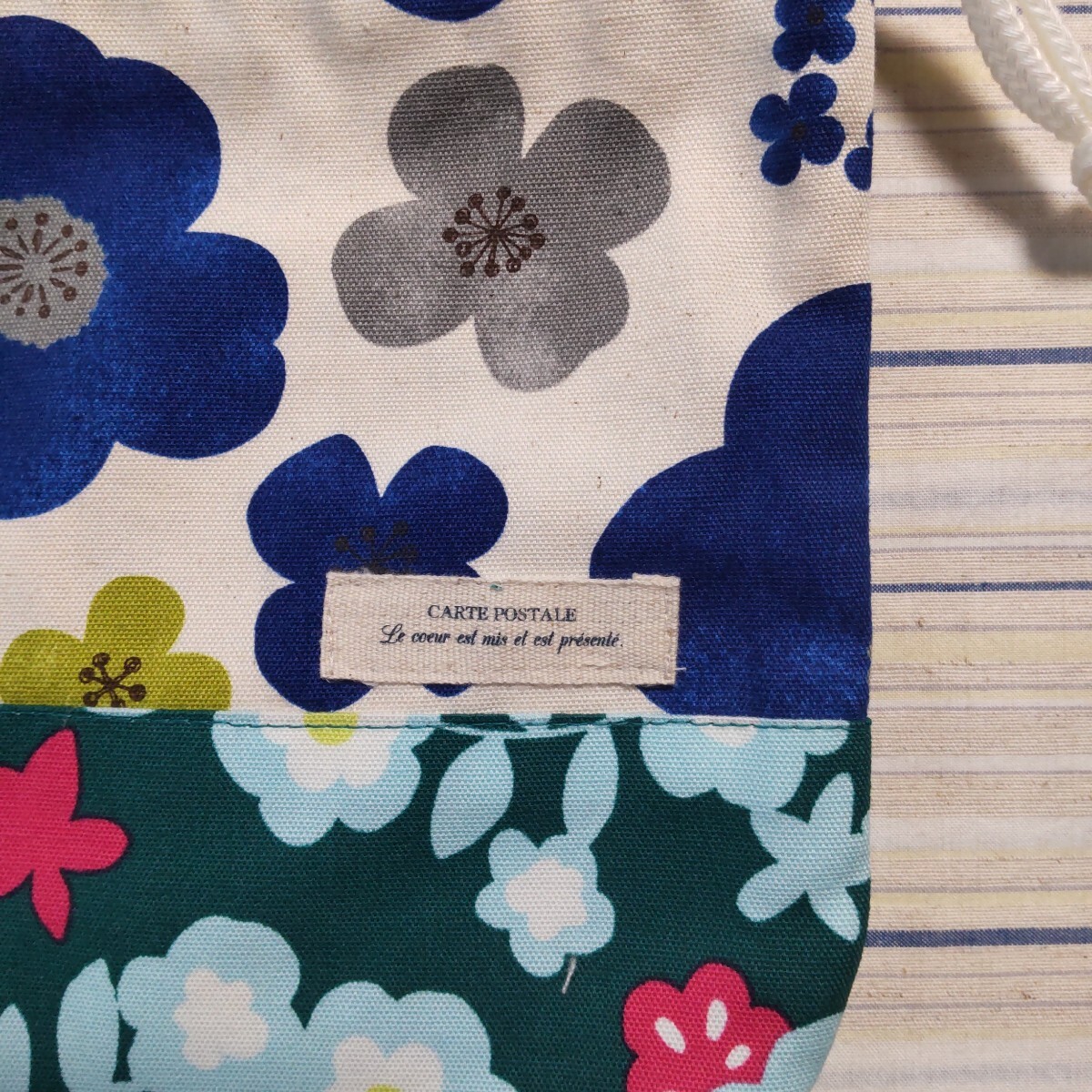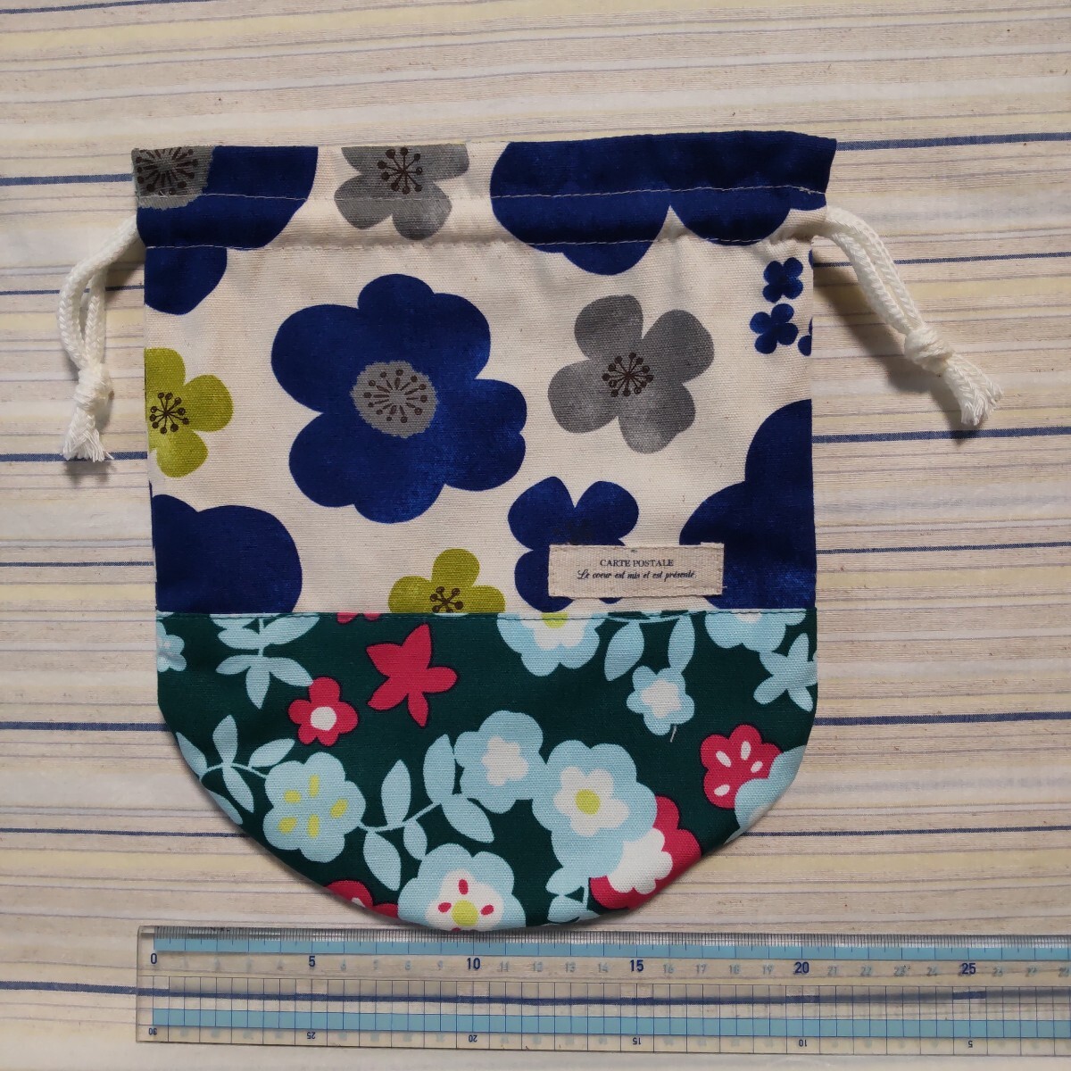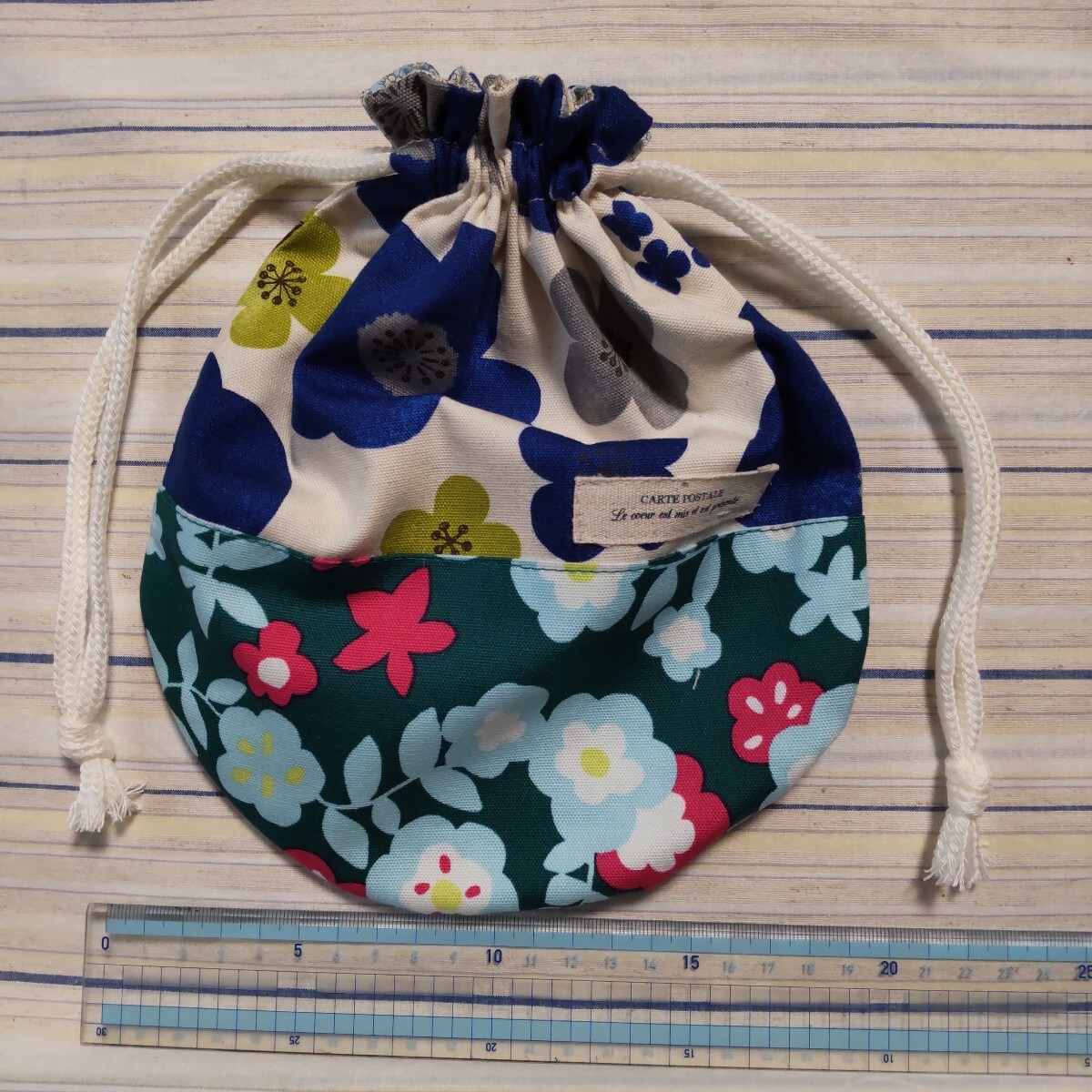 大花柄生地で作ったまんまる巾着です。 サイズはタテ23センチ、ヨコ20センチ。 生地の素材は綿オックスです。
