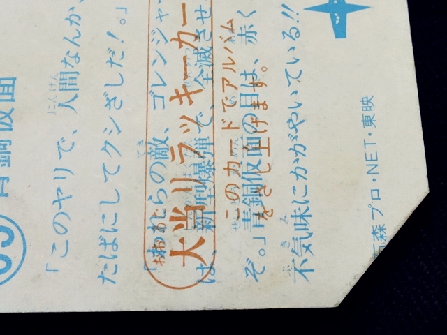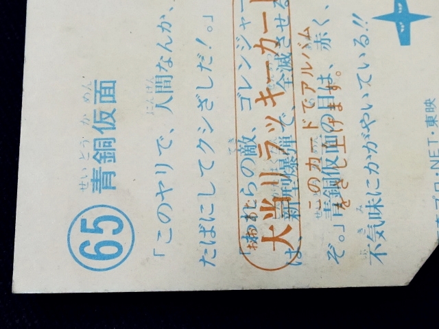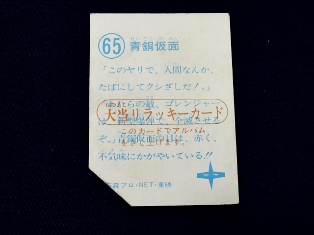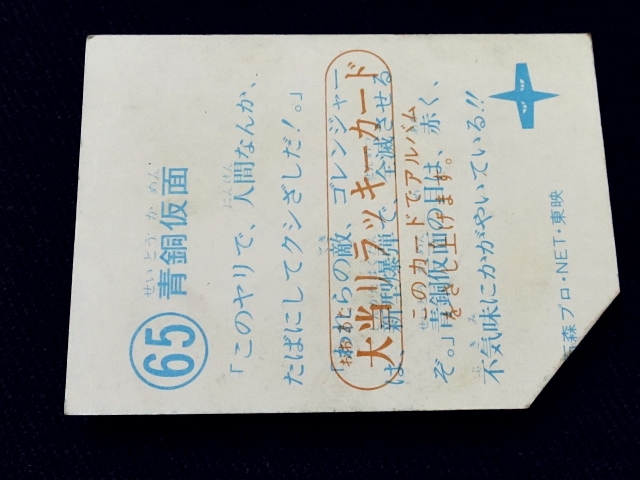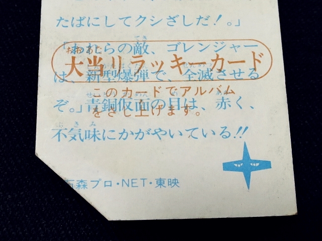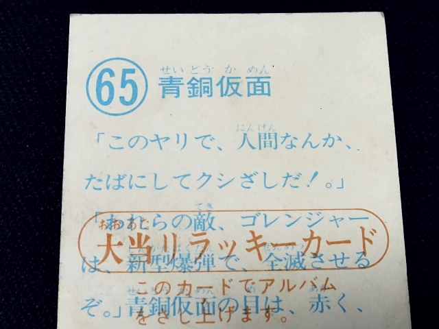 秘密戦隊ゴレンジャー ミニカード 70年代 バラ売り ・メーカー:山勝 ・1975年頃、当時の放送時に販売 ・6.6 cm x 5.0 cm ・同梱発送可能(複数落札の場合:定形、定形外郵便は、送料が変わる場合があります。) ・1-288番シリーズ ・1弾80種 001-080(タイトル違い.55.57.59.61.71.76.77,表修正.73) ・2弾32種 081-112 ・3弾64種 113-176 ・4弾48種 177-224 ・5弾32種 225-256 ・6弾32種 257-288 〓参考項目〓 ・原作:石森章太郎 ・脚本:上原正三 他 ・監督:竹本弘一 他 ・制作:テレビ朝日 ・放送期間:1975年4月- 1977年3月 ・全84話 〓出演〓 ・海城剛・アカレンジャー:誠直也 ・新命明・アオレンジャー:宮内洋 ・大岩大太・キレンジャー:畠山麦 ・熊野大五郎・2代目キレンジャー:だるま二郎 ・ペギー松山・モモレンジャー:小牧りさ ・明日香健二・ミドレンジャー:伊藤幸雄 ・江戸川総司令:高原駿雄 ・陽子・007:鹿沼えり ・黒十字軍総統:安藤三男、八名信夫 ・ナレーション:田中信夫、大平透 | ||