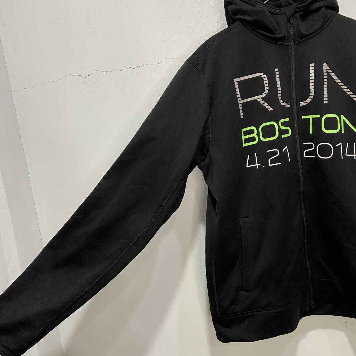 2014年ボストンマラソン記念の1着です。ブラックカラーに蛍光カラーのロゴが映えています。サラッとしたテック系の生地感です。左袖にはノースフェイスのロゴも入ります。
