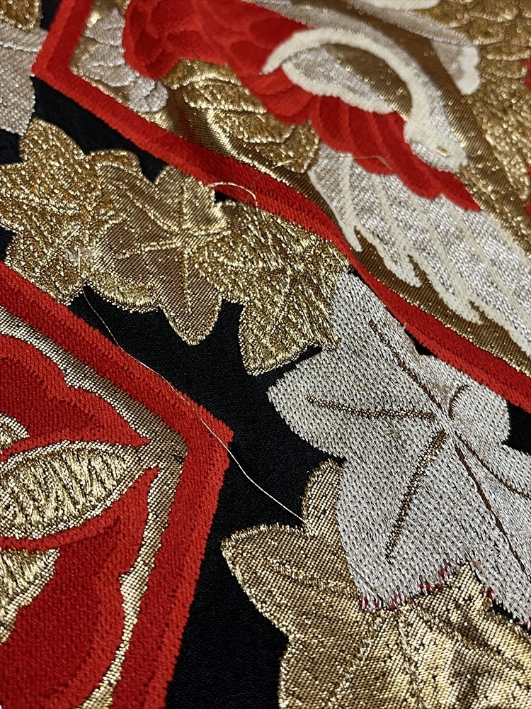 黒地に向かい鶴と向い蝶の菱紋に楓が織り出されています。