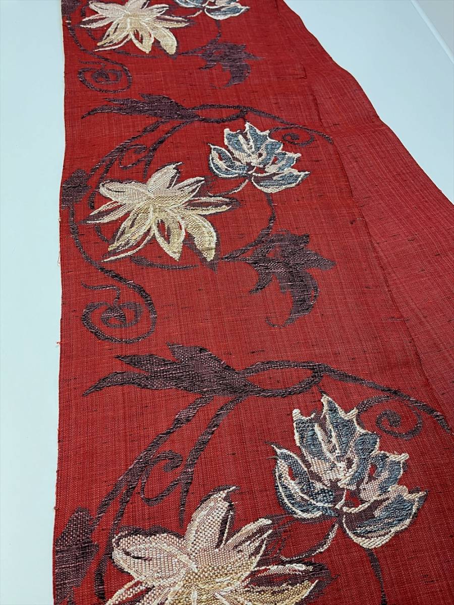 赤の紬地にモダンな花が織りされて名古屋帯です。