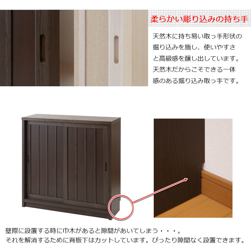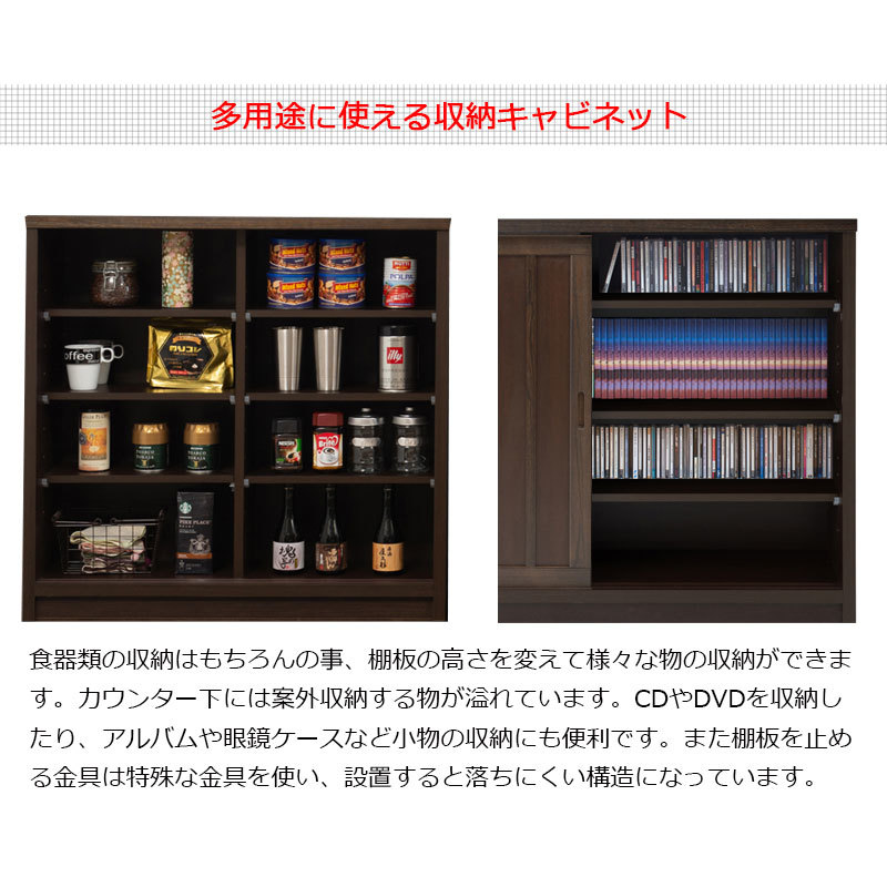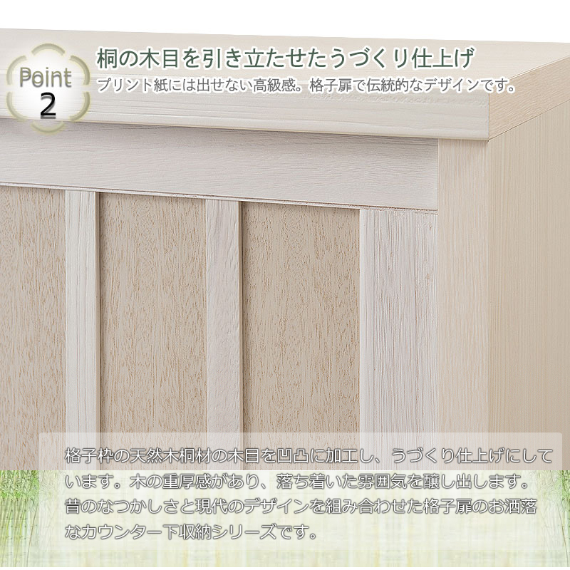 ■商品について/長く使える品質と高級感漂うデザインの【Tatis】シリーズが新登場!桐の木目を引き立たせたうづくり仕上げ、職人が組み上げた、日本製の完成品ならではの洗練されたデザインが魅力的なキッチンカウンター下収納シリーズです。和室はもちろん、洋室でも違和感なくお洒落なお部屋に演出してくれます♪2枚扉の引き戸式カウンター下収納は、すっきりとした仕上げがリビングに置いても飽きのこないデザインになっています。食器類の収納はもちろんの事、棚板の高さを変えて様々な物の収納ができます。カウンター下には案外収納する物が溢れています。CDやDVDを収納したり、アルバムや眼鏡ケースなど小物の収納にも便利です。また棚板を止める金具は特殊な金具を使い、設置すると落ちにくい構造になっています。カウンター下などデッドスペースに、造り付けのようなしっかりとした収納スペースが作れます。他のシリーズと合わせて、キッチンやリビングなどでお洒落に収納できます。