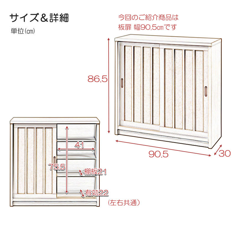 ■扉内寸/(約)(左右共通)幅41×奥行22(棚板21)×高さ75.5cm