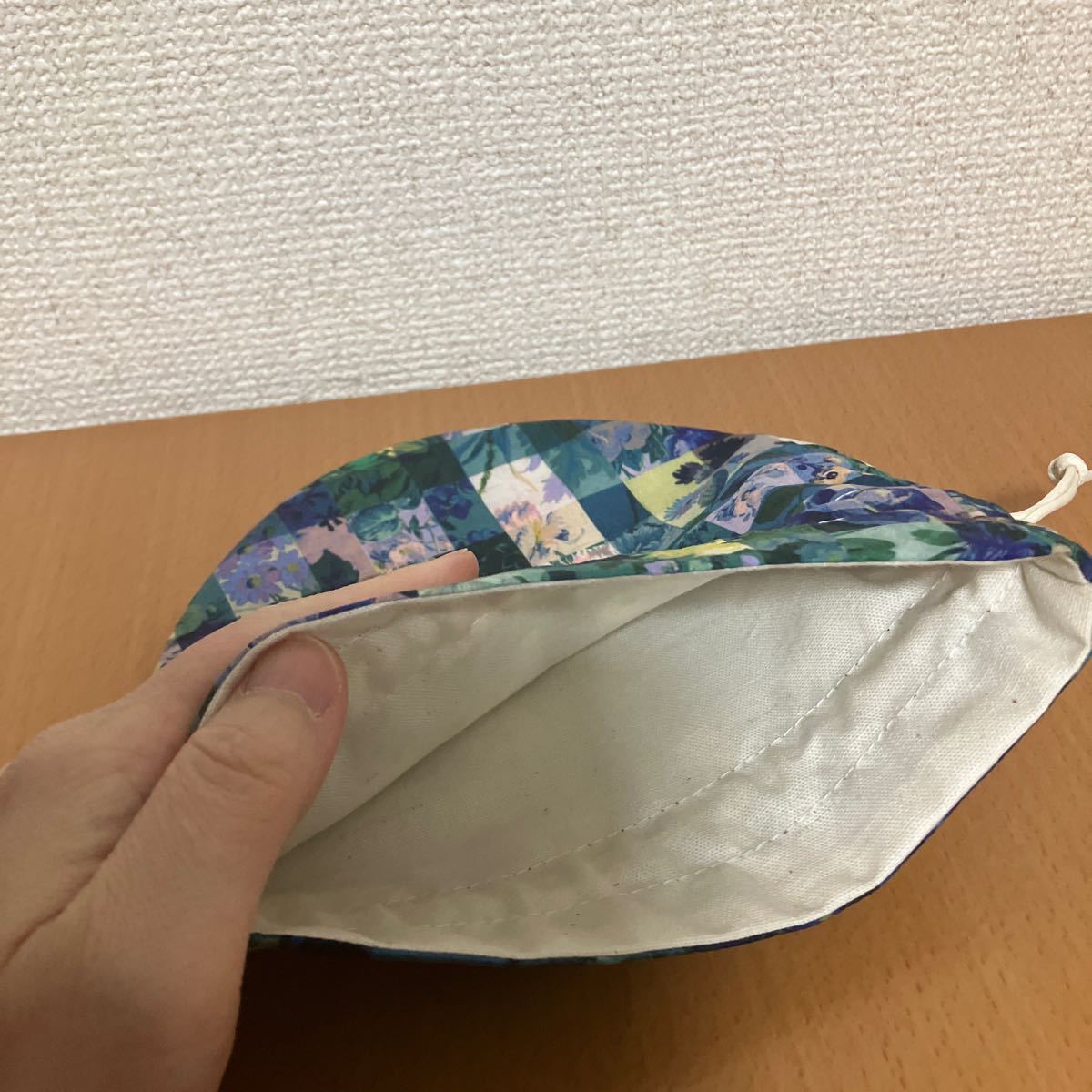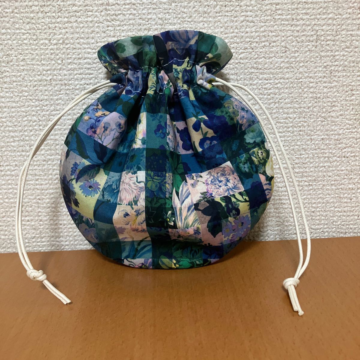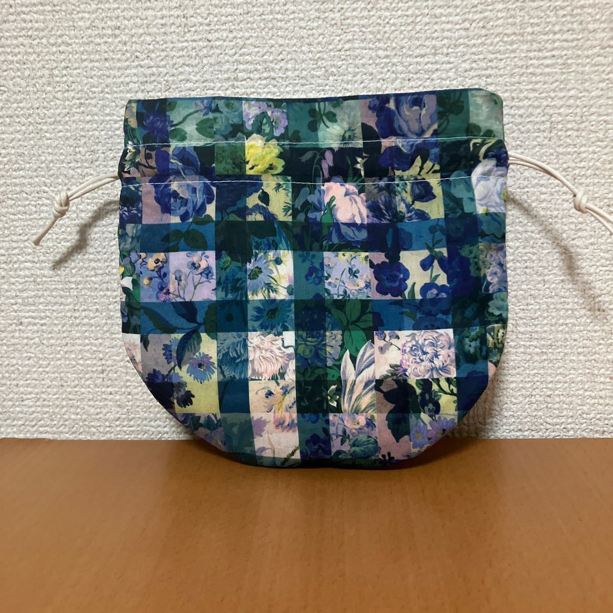 リバティサンドウオリジナルカラーの生地を使用し巾着袋を作りました。接着芯は貼らずに作りました。柔らかい仕上がりです。