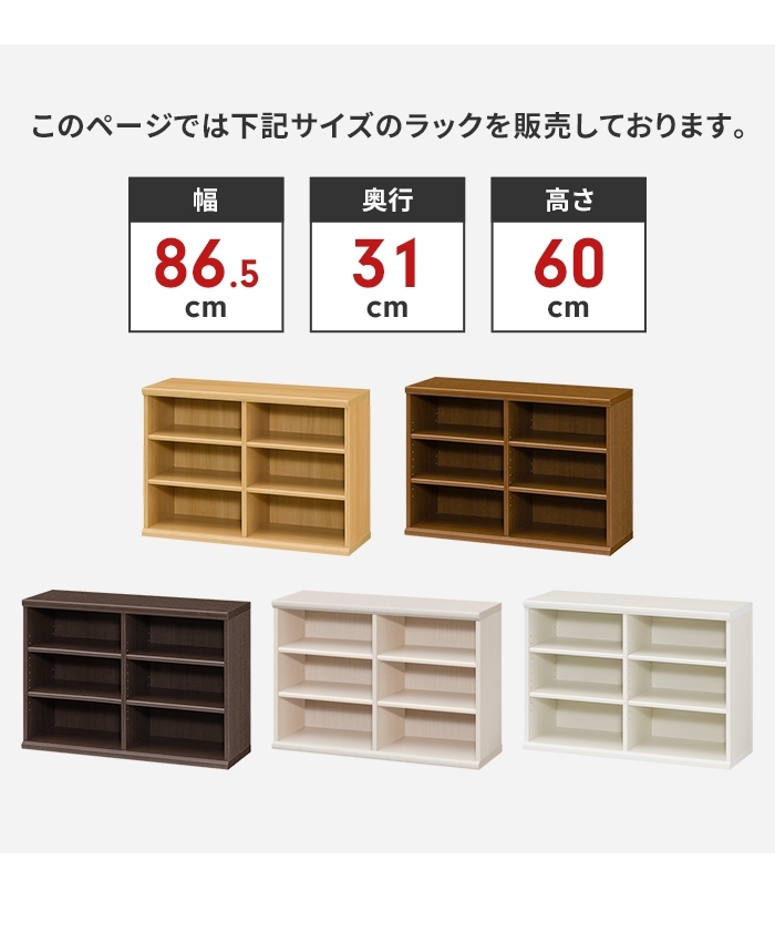 ※【同シリーズ】のリンクは当店のヤフオク店のページへ進みます。 エースラック/カラーラック 【本体(奥行31cm※共通)】 ● 高さ60cm 幅28.6cm/幅44.2cm/幅59.2cm/幅86.5cm/幅116.5cm ● 高さ88.1cm 幅28.6cm/幅44.2cm/幅59.2cm/幅86.5cm ダイワ/幅116.5cm ダイワ ● 高さ117cm 幅28.6cm/幅44.2cm/幅59.2cm/幅86.5cm ● 高さ149.9cm 幅28.6cm/幅44.2cm/幅59.2cm/幅86.5cm ● 高さ178cm 幅28.6cm/幅44.2cm/幅59.2cm/幅70.2cm/タフ 幅70.2cm/幅86.5cm ● 高さ200cm 幅28.6cm/幅44.2cm/幅59.2cm/幅70.2cm/タフ 幅70.2cm/幅86.5cm 【追加棚(奥行27.8cm※共通)】 ● 厚さ1.7cm 幅24.9cm(本体幅28.6cm用)/幅40.5cm(本体幅44.2cm用)/幅55.5cm(本体幅59.2cm)/幅66.5cm(本体幅70.2cm) ● 厚さ2.5cm(タフ) 幅66.5cm(本体幅70.2cm) ※このページは[本体(高さ60cm/幅86.5cm)]を販売しております。 |