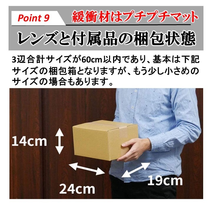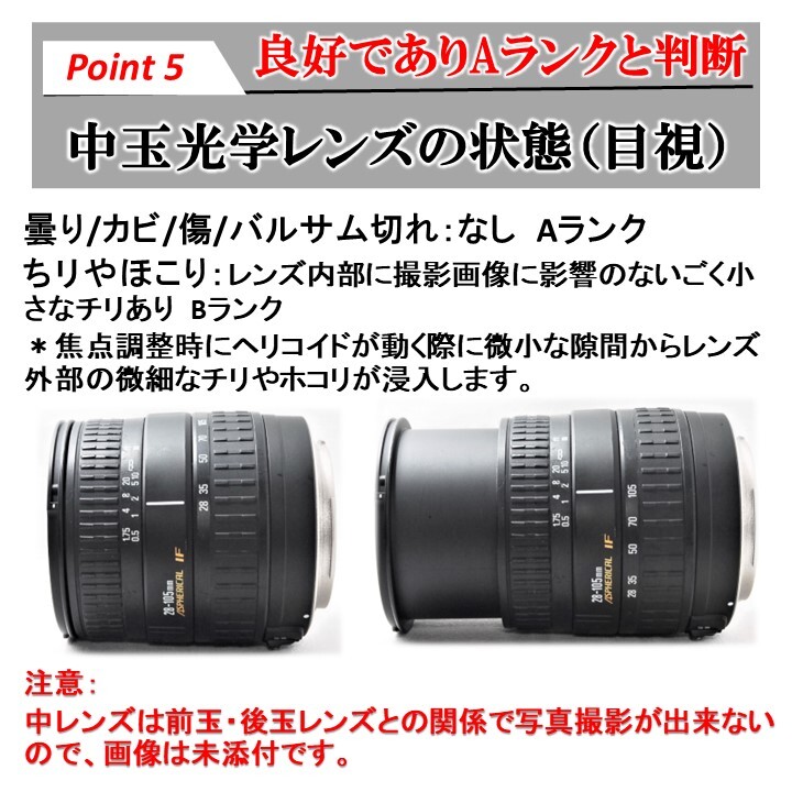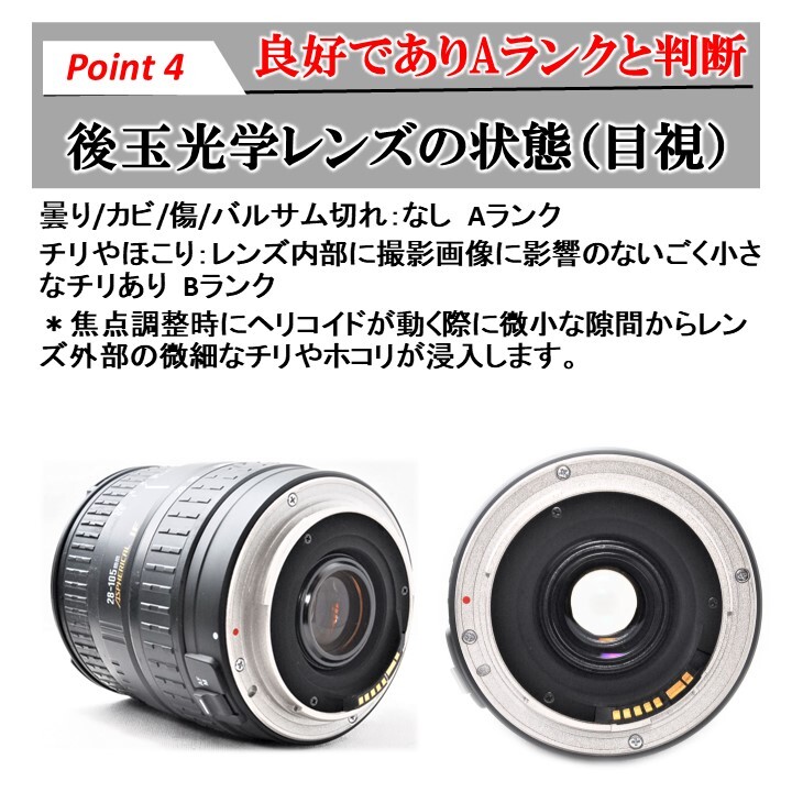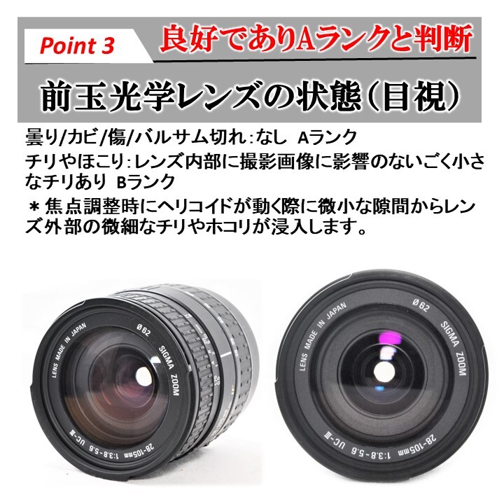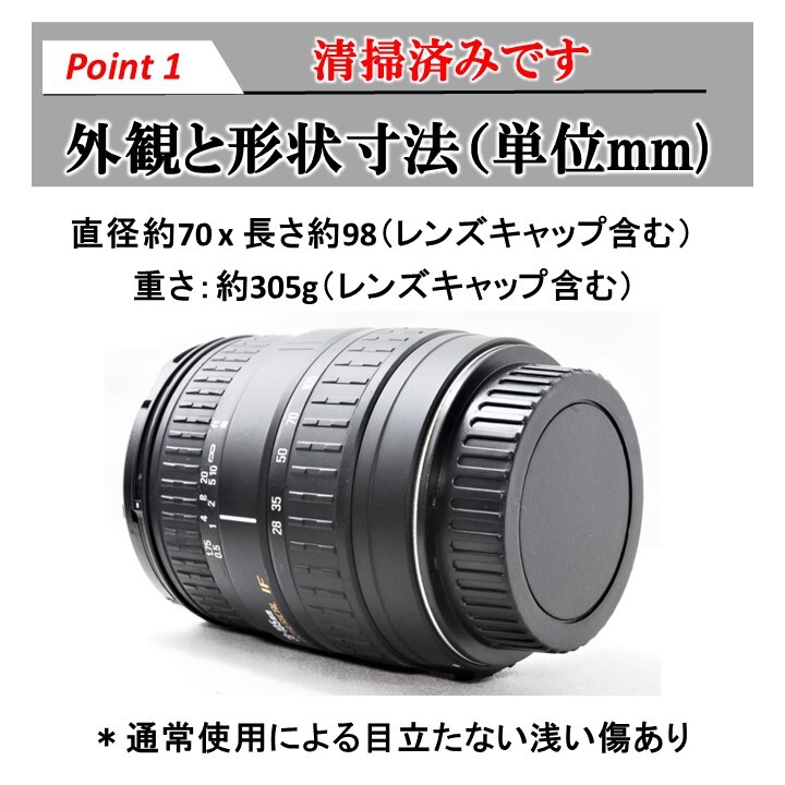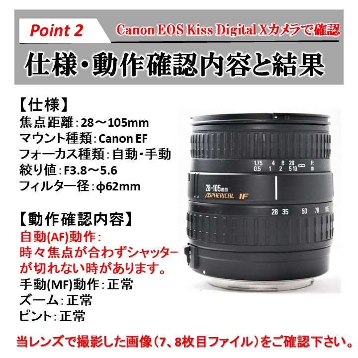 | ご訪問ありがとうございます。 小さくて軽く機動性が良い中望遠レンズ。 送料無料・24時間以内発送・即購入OKです。 消毒と静電気除去を併用した洗浄液を使用し本体とレンズは清掃済み。 【商品詳細】 ★28-105mmのズームレンズ。 ★AF動作時は自動焦点動作が緩慢で、時々シャッターが切れません。 出品レンズにて撮影した画像も添付しましたので、ご確認ください。 【レンズ仕様】 ・メーカー:Sigma ・レンズ名:Sigma Zoom 28-105mm f3.5-5.6 UC-Ⅲ for Canon ・シリアル番号:2024716 ・焦点距離:28-105mm ・マウント種類:Canon EF ・フォーカス種類:自動/手動 ・絞り値:3.5-5.6 ・フィルター径:62mm ・サイズ:直径約70mm x 長さ約98mm(レンズキャップ含む) ・重さ:約305g(レンズキャップ含む) 【総合評価】 美品Bランク 【外観の状態】 ・汚れ/破損/部品欠落:なし ・擦り傷:通常使用による浅い傷あり ※外観状態は写真でご判断下さい。 【光学系の状態】 ・クモリ/カビ/傷/バルサム切れ:なし ・チリやほこり:レンズ内部に撮影画像に影響のないごく小さなチリ少しあり Bランク ※あくまで出品者見解ですので、ご参考程度とご理解下さい。 【動作確認結果】 Canon EOS Kiss Digital Xカメラにセットして確認しました。 ・AF動作:自動焦点動作が緩慢で、時々シャッターが切れません。 ・MF動作:正常 ・ズーム/ヘリコイド:正常 【付属品】前玉/後玉レンズキャップ 【定価】32,800円 【出品番号】#7312 【返品】 説明欄に記載した基本性能を満足せず撮影ができない場合には、お客様受取り後3日以内に限りご返品を受け付けいたします。その際にはこちらから発送した箱と梱包材を使用し着払いにてご返品ください。 【梱包方法】 ビニール袋に収納したものをプチプチマットで包み、箱に入れて発送いたします。 【発送について】 ・発送日:ご購入頂き、ご入金とご住所の確認ができ次第24Hr以内に発送します。 ・配送方法:日本郵便 ・到着目安:2~5日程度(実働日数) ※北海道、沖縄、離島の場合はもう少しかかることもございます。 | |||