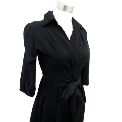 ナチュラルビューティー NATURAL BEAUTY ワンピース ひざ丈 五分袖 スキッパーカラー リボン ウール 38 黒 ブラック /SM45 レディース