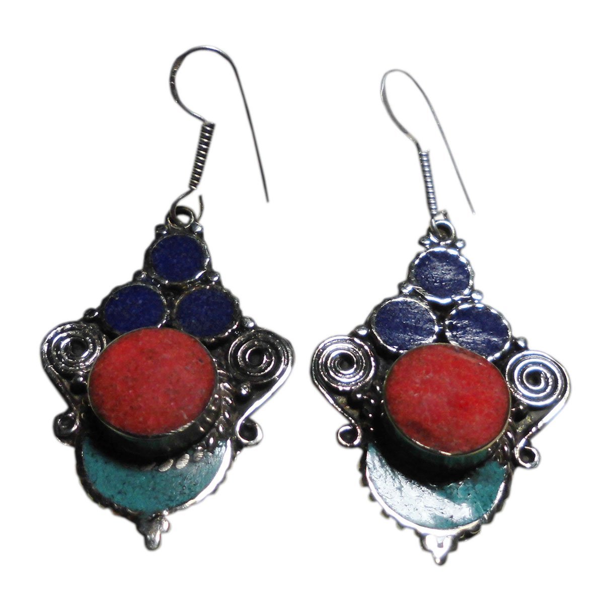 ■☆アジアン雑貨 ネパール銀職人 天然石メタルピアス ラピスラズリ・山サンゴ・トルコ石 (MTP-21)