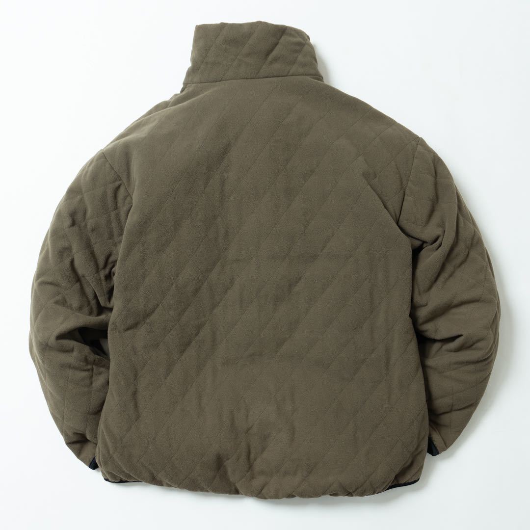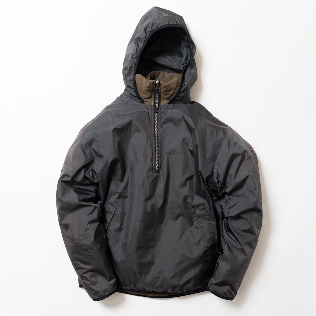 プルオーバータイプのジャケットで、オリーブのフリース面とブラックのナイロン面のリバーシブル仕様です。