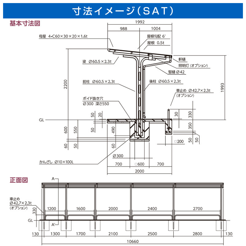| 商品詳細 | この度は数ある商品の中から当商品を閲覧頂きまして有難う御座います。 販売価格 188,800円(送料・税込み) 安全性・快適性を追求したサンキンの駐輪屋根。 お住まいの外構はもちろん、店舗、公共施設、マンション、アパートなどの 駐輪屋根としてシャープなスタイルが今までの外構シーンを一新します。 ・施工性・安全面を考慮した設計で、屋根部分の取付は組込みボルトを採用。 ・ボルト・ナット・ワッシャーの組込みの手間が無くスムーズに施工できます。 ・屋根部分のボルト固定箇所にタップ加工済み。短時間での固定が可能です。 ・施工者様の安全面を考慮し、屋根部分を含め、全て地上から施工できる設計です。 ・設置現場に応じて間口・奥行の切り詰め加工が可能。(受注生産、別途お見積り) 商品名:サンキン自転車置場サイクルシステム SAT-2800 サイズ:間口2800mm×奥行1992mm×高さ2200mm 屋根寸法:間口3060mm×奥行1992mm 収納台数:7台 積雪荷重:1200N/平方m 柱仕様:中柱仕様・柱基礎埋込み仕様 主要部材材質:柱・梁:亜鉛めっき鋼管(Φ60.5×2.3) 屋根材:エコガルめっき鋼板(耐酸性・耐アルカリ性の両方に優れています) 母屋:亜鉛メッキ鋼板(t=1.6(4本)) 標準装備:樋セット(3連に1箇所) オプション:柱基礎ベース仕様・車止め(U字タイプ/ストレートタイプ)・照明器具 ・壁パネル オプション品をセットでご希望の場合は、ご注文前にお気軽にお問い合わせください。 お見積りをご案内いたします。 寸法詳細図はこちらよりご覧いただけます。 【取扱ご注意】 ●多雪時は雪下ろしをしてください。 ●屋根に、乗ったり、物を載せたり、ぶらさがったりしないでください。 ●本体の改造や変更はしないでください。 ●自転車置場以外の目的 (遊び場、住居の一部など) に使用しないでください。 ●本体内や周囲で子供を遊ばせないでください。 ●乱暴に扱ったり、 ゆすったりしないでください。 ●物を立てかけないでください。 ●建家の屋根から、 雨水が直接落ちないようにしてください。 ●屋根や雨樋には枯葉やゴミがたまりがちです。 定期的に掃除をしてください。 ●汚れたら水洗いやワックスがけなどをしてください。 ●傷がついた場合は、 なるべく早く補修してください。 ●屋上や崖の縁など安全の確認できない場所への設置は避けてください。 ●避難通路付近には設置しないでください。 ●建家の屋根の雪などが、 落下する恐れのある場所への設置は避けてください。 ●転倒防止のため所定の基礎工事を必ず行なってください。 ●組立て後、ボルトや金具の付け忘れやゆるみがないか確認してください。 ●作業中に付着した切り粉を完全に取り除いてください。 |