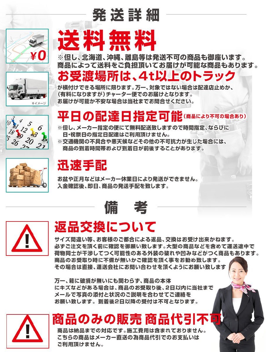 | 発送詳細 | ・送料無料 ※但し、北海道、沖縄、離島は発送不可の商品となります。 ・配送用の4tトラック(ワイド、箱車含む)でのお届けの為、トラックが現場まで 通行できるかを必ず確認して下さい。 ・道路が狭いなどの理由で、配送車両が現地に到着できない場合、お客様に お引き取りをお願いする場合があります。 お客様によるお引き取りが不可の場合、チャーター便追加料金が発生いたしますの で、道路幅などは確実にご確認ください。 ・大型商品のお引渡しは、一階渡しとなります。 2階以上の階上げは 行っておりません。 ・年末・年始・お盆・ゴールデンウィークや年度末等の繁忙期前後の渋滞や 工事混雑、配送混雑、台風・地震・雪等の天災により遅れる場合が 御座います。 それによる設置工事の遅れ等については、当店では責任を負いかねますので予め ご了承下さい。 ・配送会社のやむを得ない事情により納期が遅れる場合がございます。 その場合、当店では責任を負いかねますので予めご了承下さい。 ・配達日指定できます。 (施工日に合わせた配達が可能です。) ※但し、メーカー指定の便にて無料配送致しますので時間指定、 ならびに日・祝祭日の指定日配達はご利用頂けません。 ※交通機関の不具合や悪天候などその他の不可抗力が生じた場合には、 商品の到着時間帯および到着日が前後することがありますのでご了承下さい。 ・お盆や正月などはメーカー休業日により発送ができません。 ・発送元について、お届け先に近い工場から出荷する場合も御座います。 |