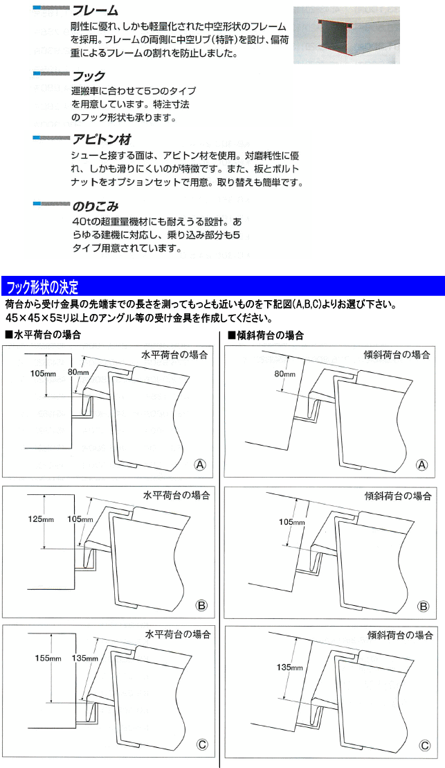 | 【のりこみ種類・フック形状の選択について】 のりこみ種類、フック形状がそれぞれ複数存在致します。 ご落札頂きましたお客様におかれましては、「取引連絡」等で「のりこみ種類」・「フック形状」の 指定をお願い致します。 ご指定がなかった場合は、下記基準にて商品をお届け致します。 ・のりこみ種類 ご指定のない場合は各規格毎に設定された「のりこみ種類」となります。 規格1.5t用、規格3.0t~5.0t用、規格7.0t~40.0t用 ※のりこみ種類の詳細は下記画像を参照 ・フック形状 ご指定の無い場合のフック形状は、3.0t~5.0tで(B)、7.0t~40.0tで(C)となります。 ※フック形状の詳細は下記画像を参照 |
