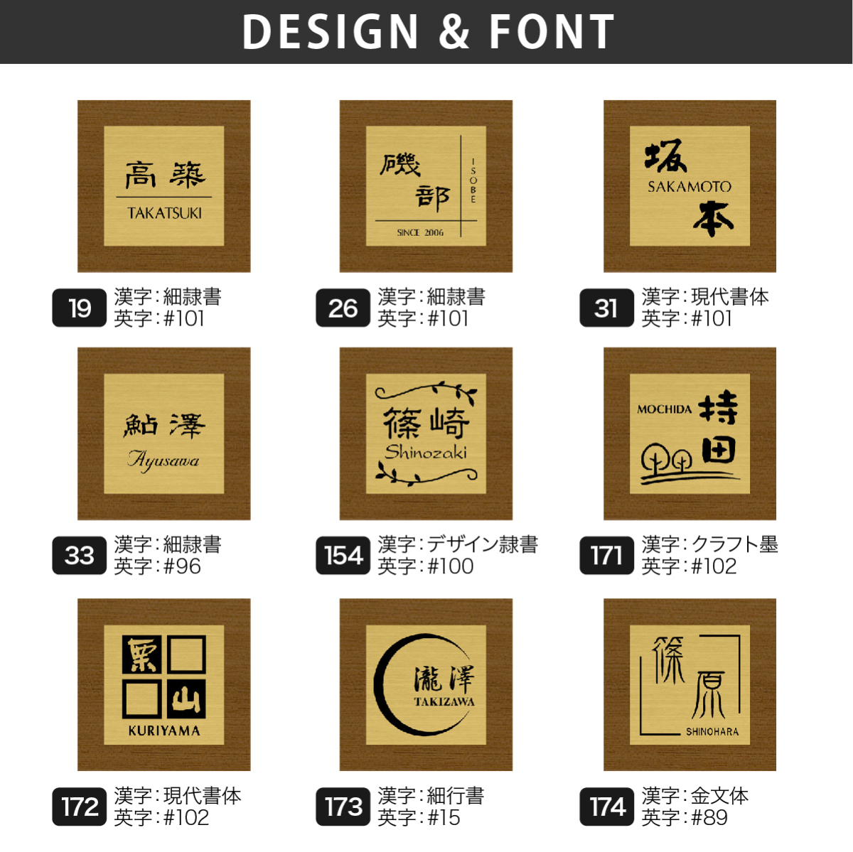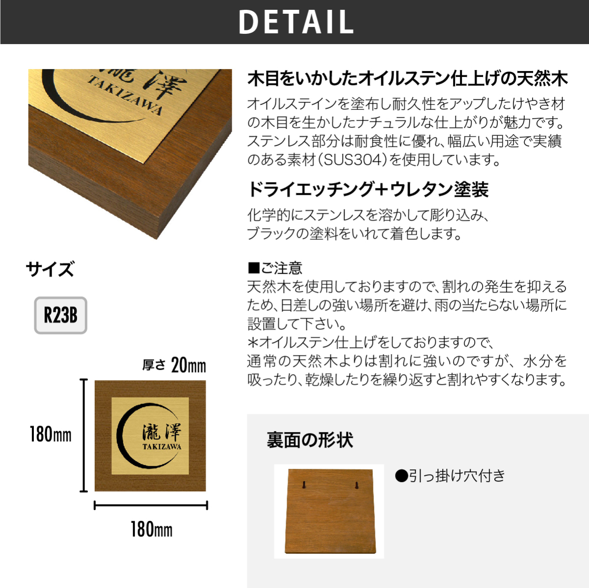 | 商品詳細 | けやき材を使用し、天然成分由来のオイルステインを塗布し耐久性をアップしました。木目を生かしたナチュラルな仕上がりが魅力の表札です。ゴールドステンレス部分はステンレスの中でも耐食性に優れ、幅広い用途で実績のある素材(SUS304)を使用しています。ドライエッチングにより金属表面に微細な凹凸をつくり塗料の密着性を高めてから塗装します。塗料は自動車などにも使用される耐久性の高いウレタン塗料で塗装していますので屋外でも安心してご使用頂けます。 |