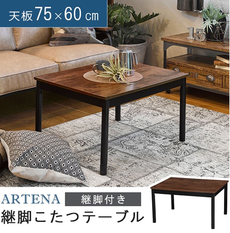 こたつテーブル アルテナ7560 75×60 小型長方形75幅 ダークブラウン色(濃い茶色)古木調の天板とスマートな脚の組み合わせのお洒落でシンプルこたつです☆寒い冬は天板と本体の間に布団をはさんで炬燵として、春夏秋はセンターテーブル、リビングテーブルとして、一年中お使いいただけます。本体と天板とは固定できないタイプです。薄型ヒーターですので外からはヒーターは見えません。■サイズ:幅75×奥行60×高さ37/42センチ■プリント化粧繊維板■継脚式■300W石英管ヒーター(MS-303H) 中間入り切スイッチ※こちらの商品はご注文いただいてから2日~3日(土日除く)での発送となります☆落札、ご入金確認後 1~2日にて発送いたします 追加納期のかかるものは商品ページに記載いたしております よろしくお願いいたします。