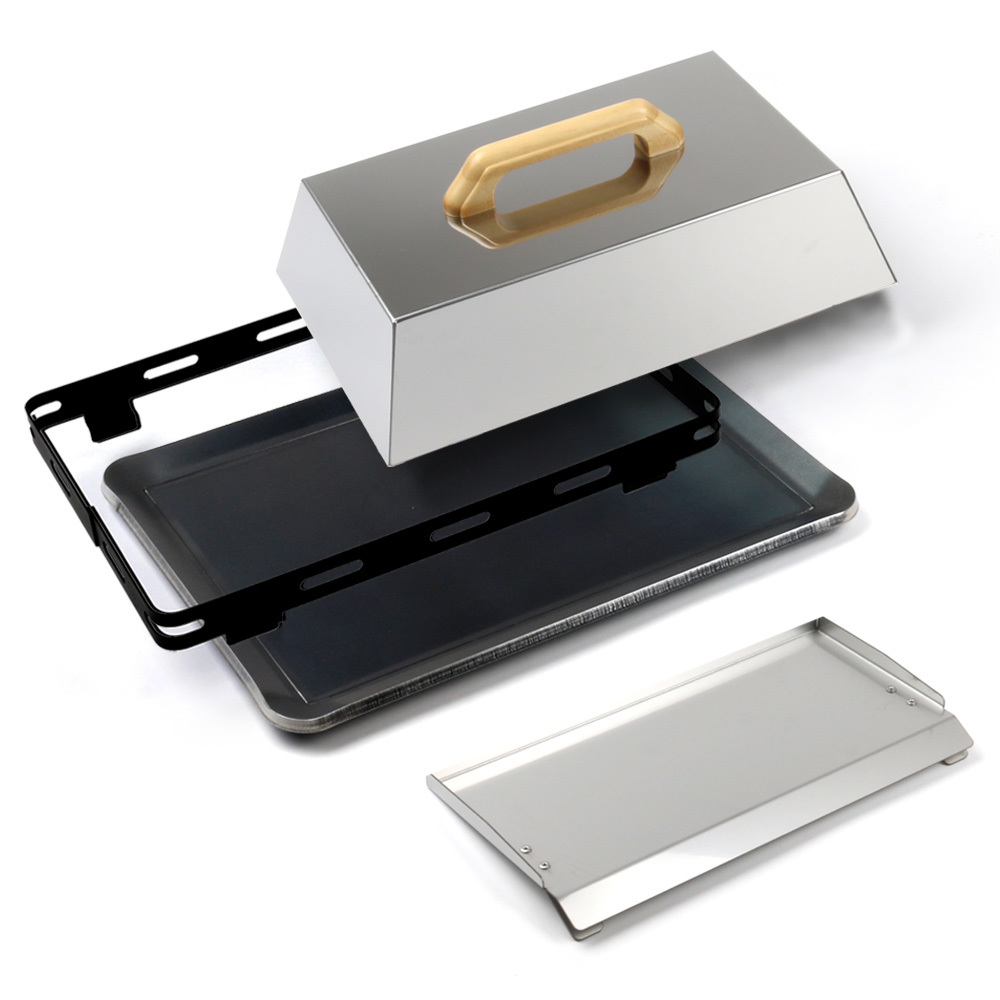 鉄板からの熱伝達で程よい保温状態を保ちますので、チーズフォンデュや、チョコフォンデュなどもお楽しみいただけます。装着することで焼面も約1.6倍のスペースとなるため、コンパクトな炙りやでもサイドトレーを装着することで人数が増えてもお使い頂けます。