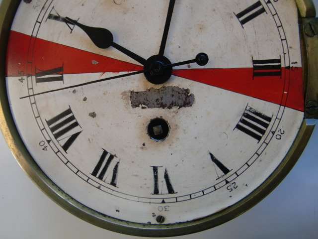 昔、船舶の無線局では遭難信号(SOS)を出している船舶がいないか、定時に無線を聴取することになっていて、その時刻が時刻盤に表示されています。(毎時15分と45分から3分間:赤の扇形)