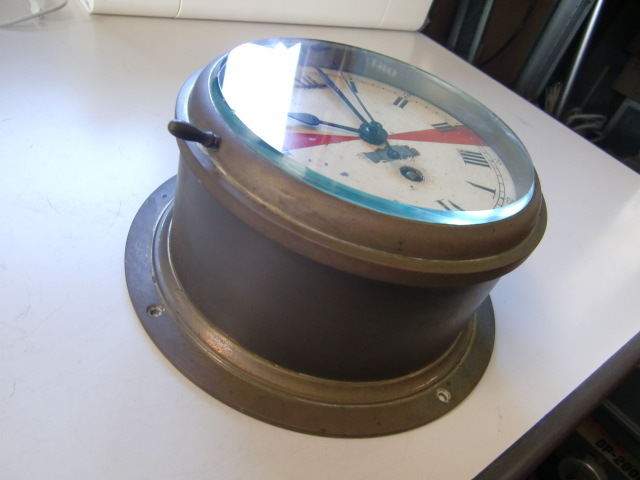 真鍮ハウジングの船舶無線室向けの重厚な壁掛け時計です。