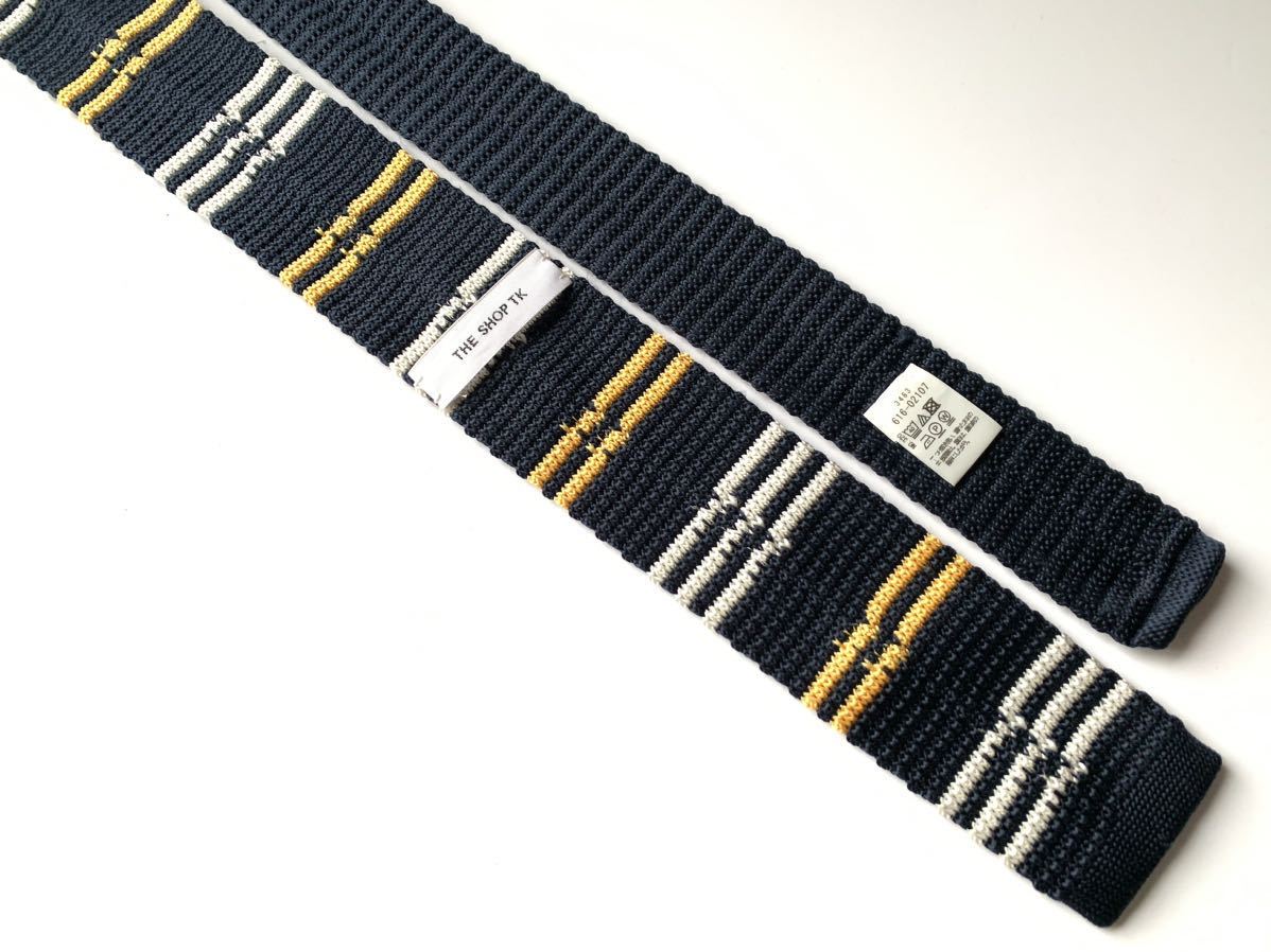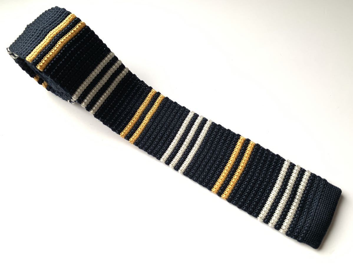 落ち着いたネイビーベースのボーダー柄ニットタイで、トラッド感溢れるネクタイです。