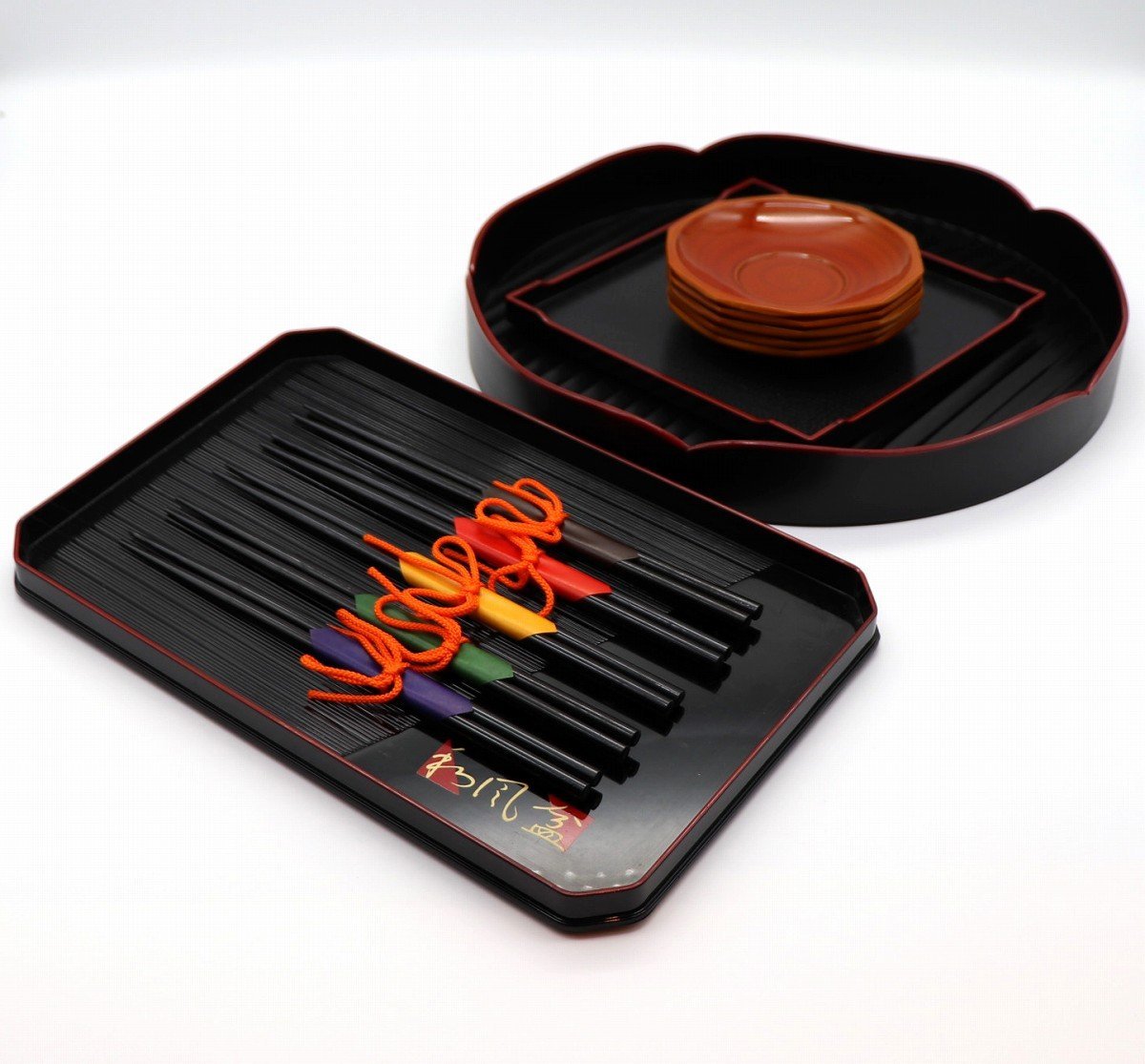 長盆1枚(長辺:約302㎜、短辺:約195㎜、高さ:約21㎜)、角盆1枚(一辺:約180㎜、高さ:約16㎜)、丸盆1枚(直径:約301㎜、高さ:約40㎜)、茶托5枚(直径:約120㎜、高さ:約20㎜)、箸5膳(長さ:225㎜)、状態ランク:C