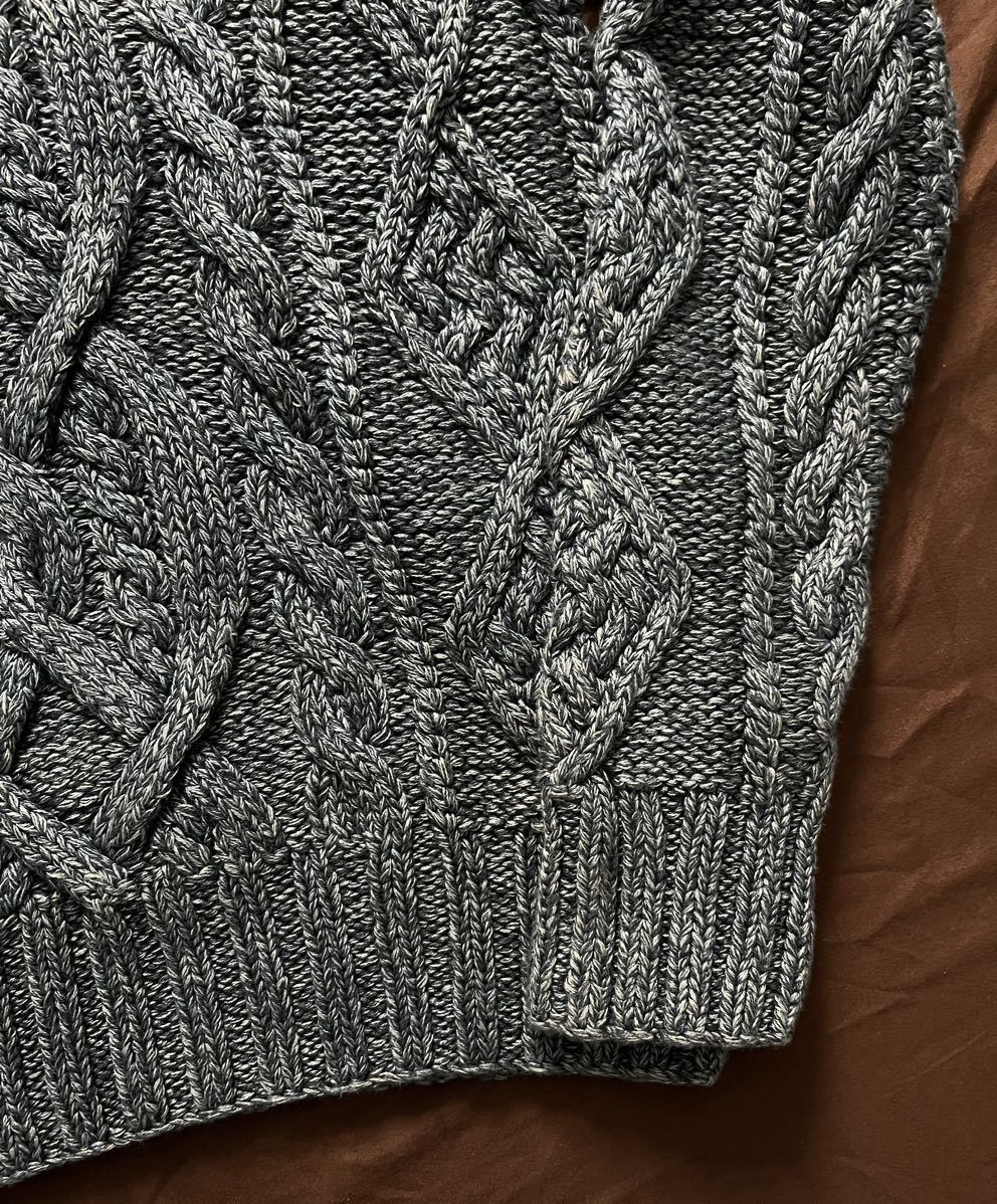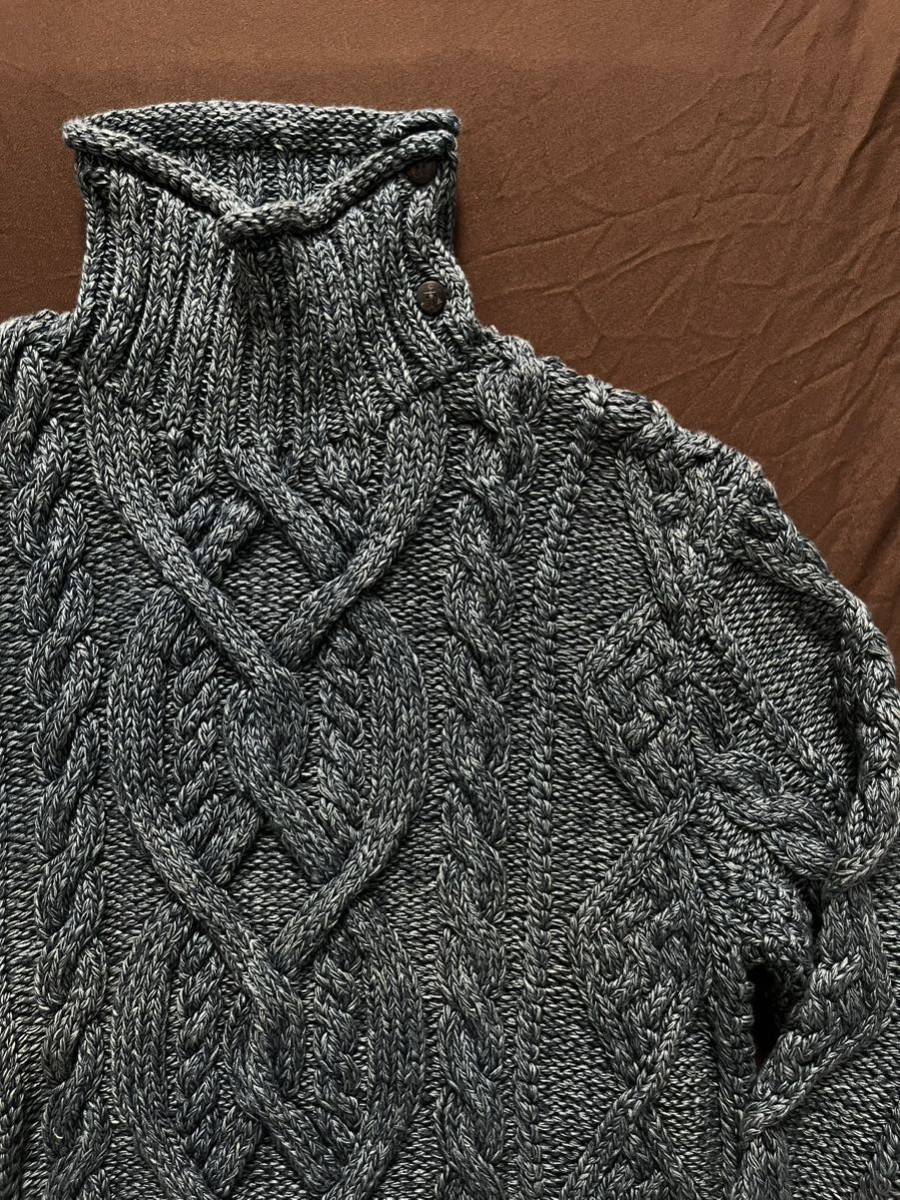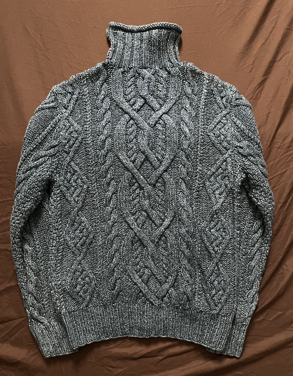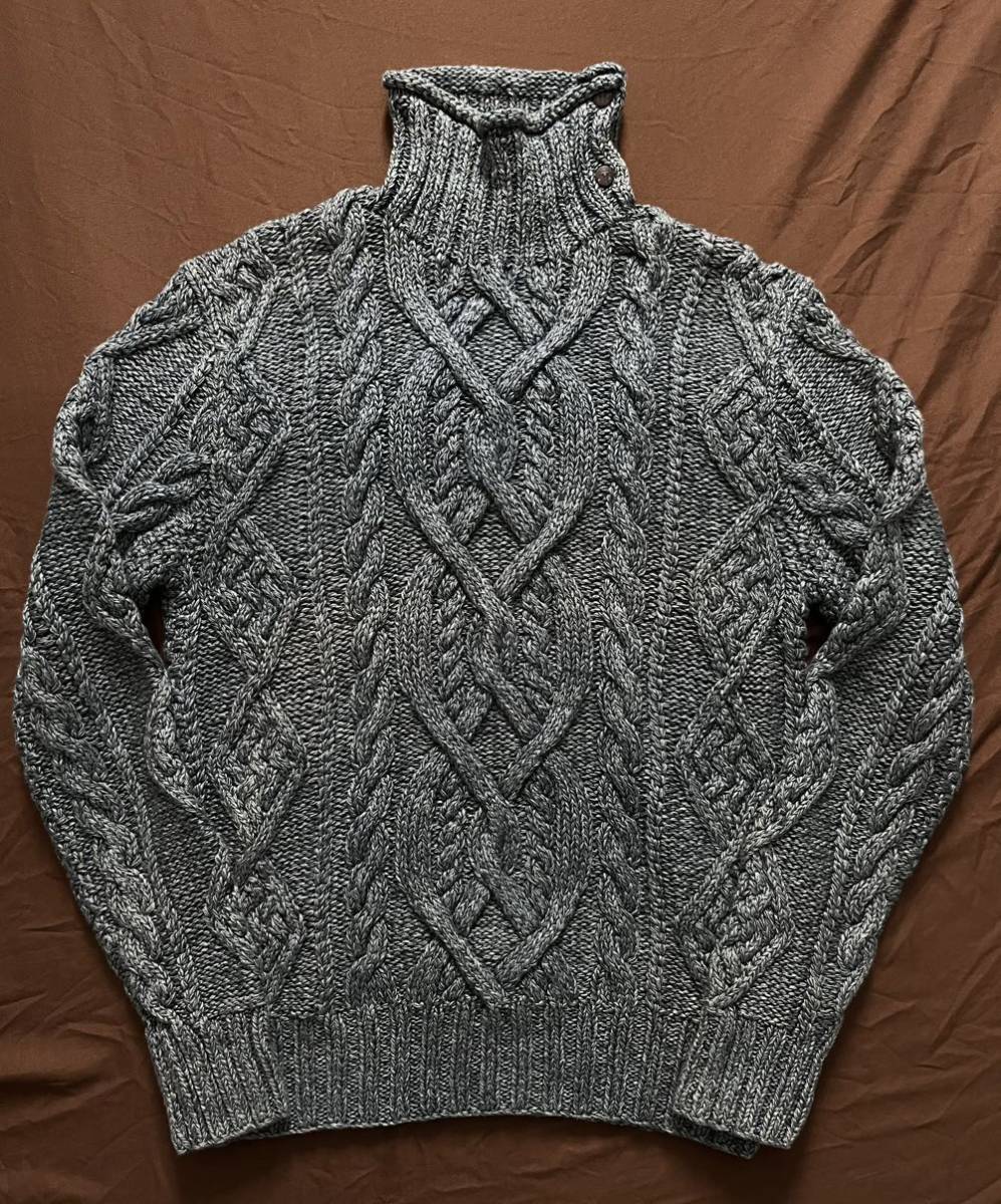 精巧なケーブル編みとハイネックのモックスタイルがオールドのフィッシャーマンニットを彷彿とさせる出来栄え。